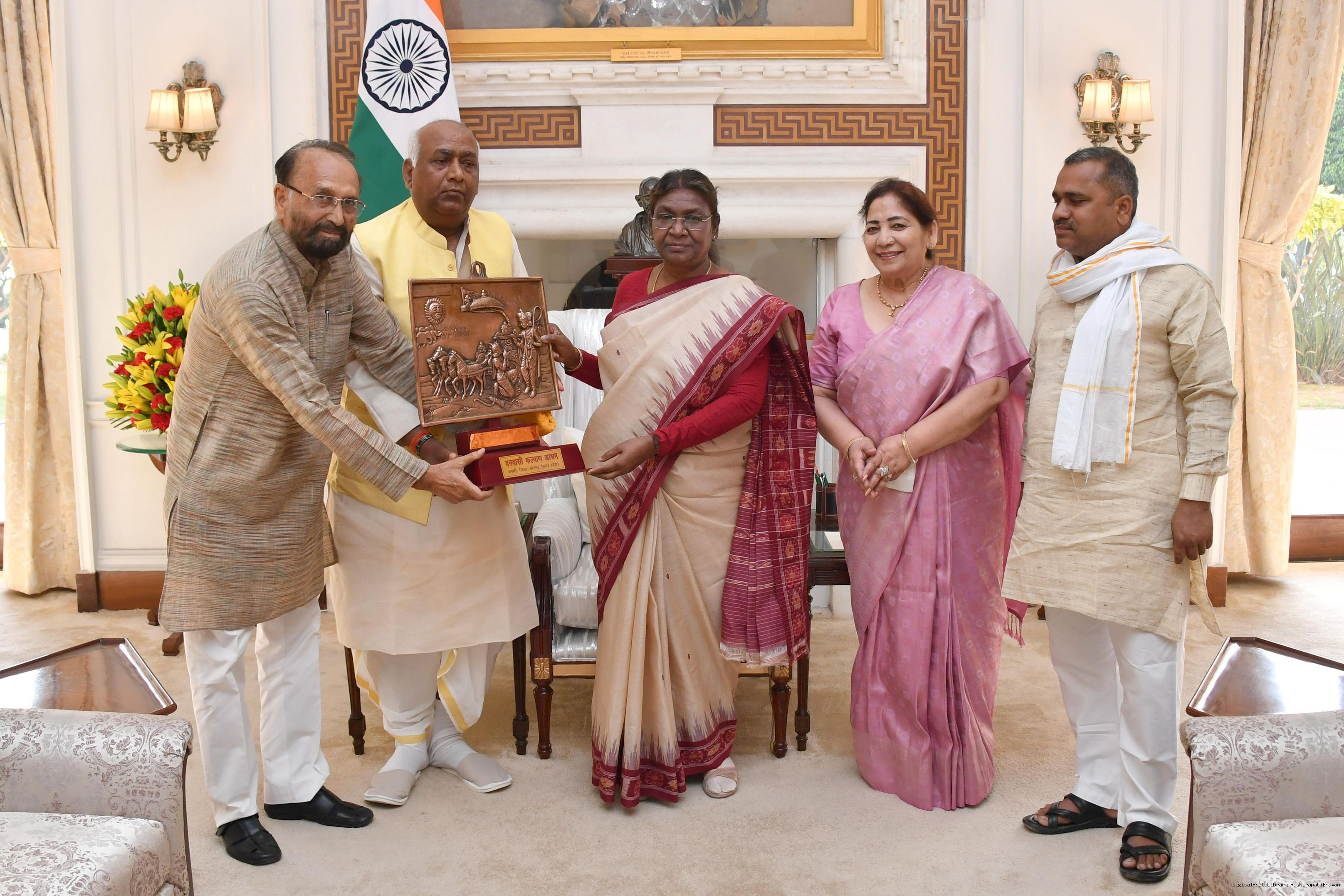 Shri Ram Shakal, MP (RS) along with Shri Anand Kumar Upadhayay, Shri Ram Bachhan Pathak along with Others meeting with the President of India Smt. Droupadi Murmu at Rashtrapati Bhavan on April 12, 2023