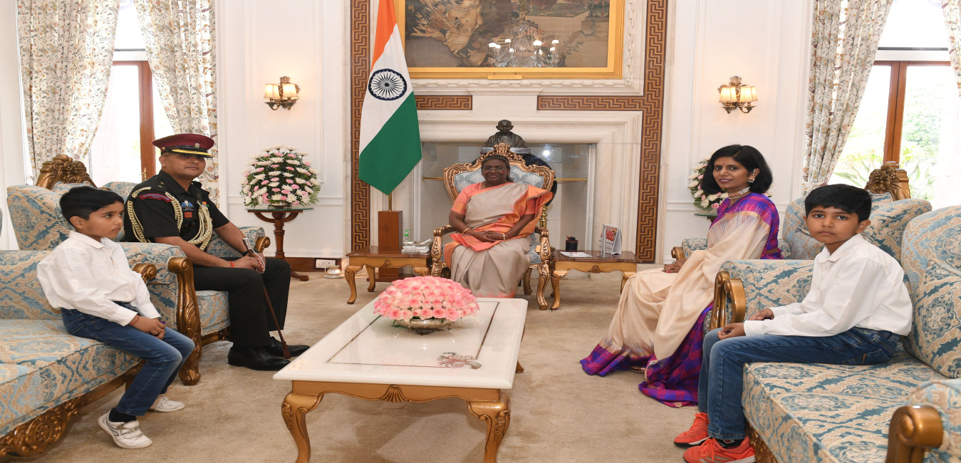 Lt. Col. Ramakant Yadav, Second-in-Command, The President's Bodyguard (PBG) along with others meeting with the President of India Smt Droupadi Murmu at Rashtrapati Bhavan on April 15, 2024.