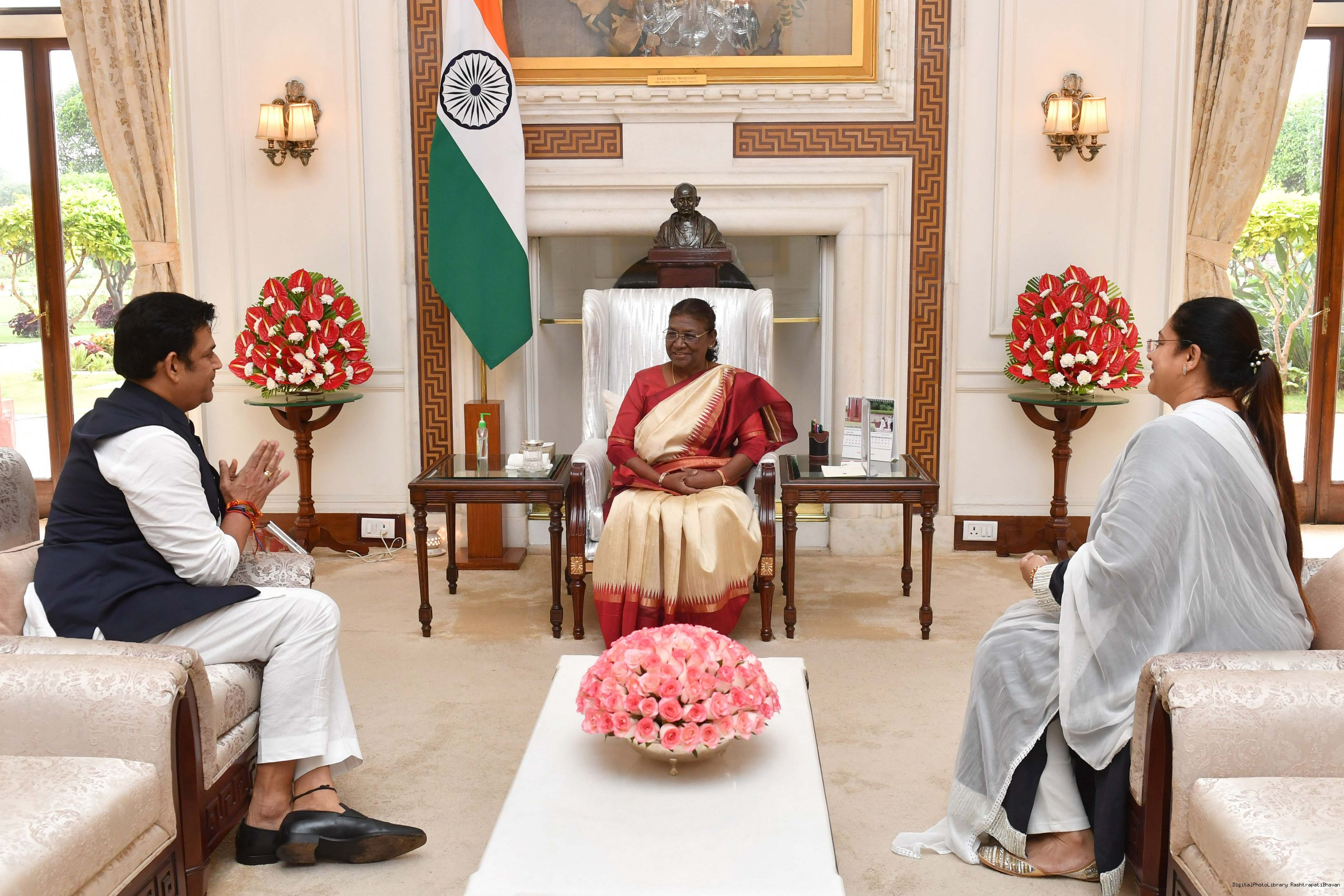 Shri Ravi Kishan Shukla, MP, along with his wife Smt. Preeti Shukla meeting with the President of India, Smt. Droupadi Murmu at Rashtrapati Bhavan on August 09, 2023.
