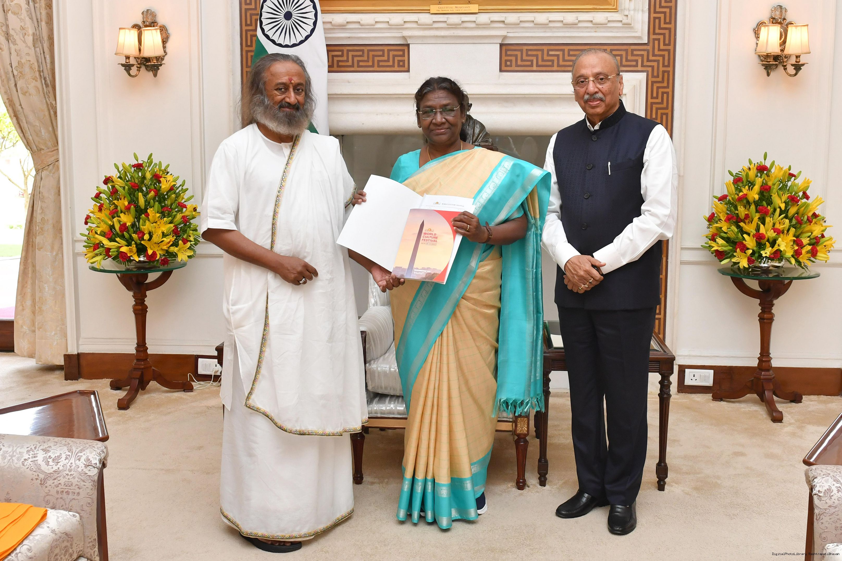 Sri Sri Ravi Shankar, Founder, The Art of Living along with Dr. Mahesh Gupta, Ex-Chairman, Art of Living Trust meeting with the President of India, Smt. Droupadi Murmu at Rashtrapati Bhavan on June 12, 2023.