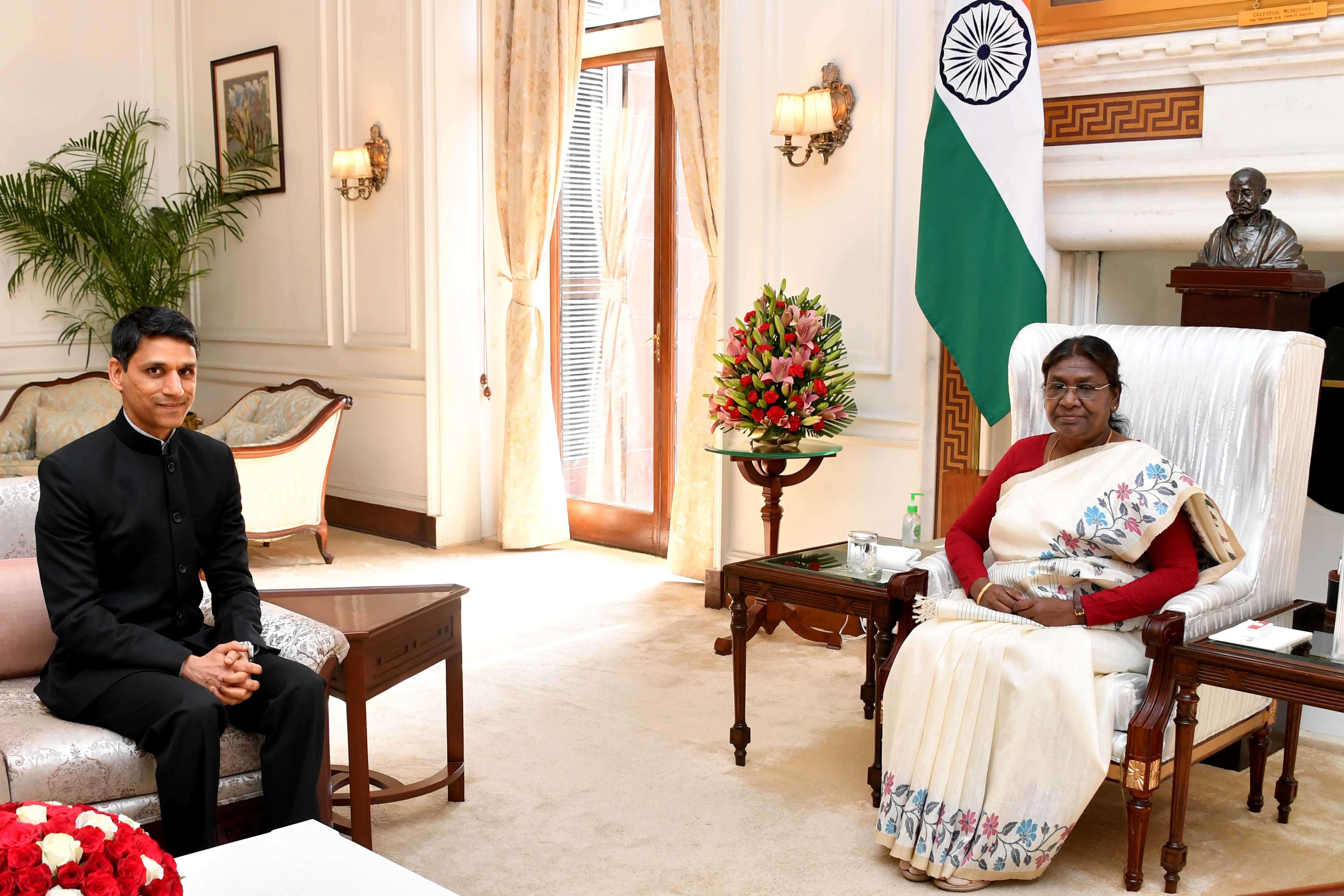 The Ambassador-designate to the Islamic Republic of Iran, Shri Rudra Gaurav Shresth meeting with the President of India, Smt. Droupadi Murmu at Rashtrapati Bhavan on April 25, 2023