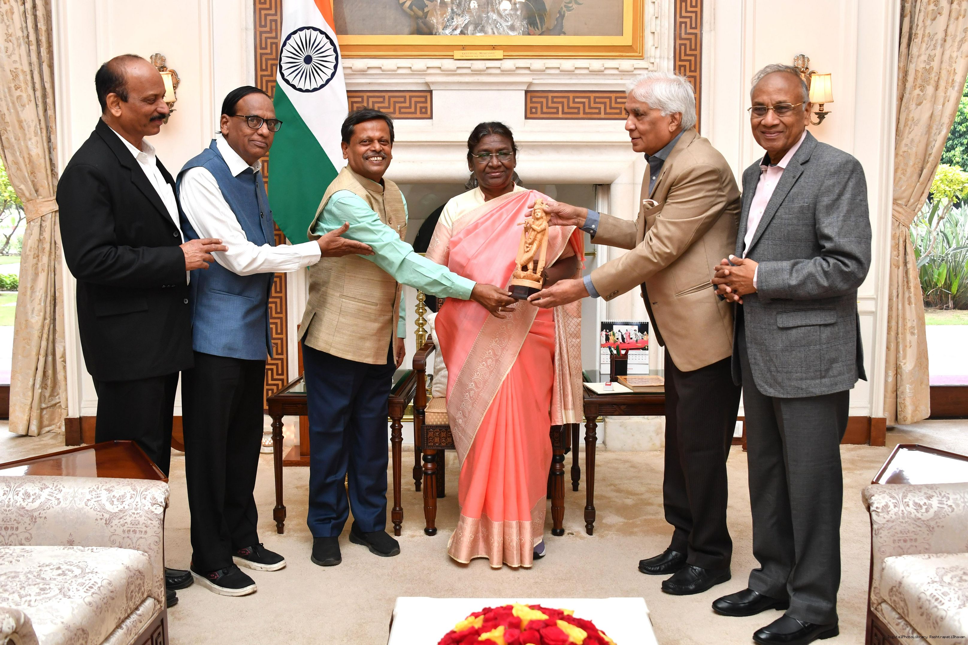 Shri S.M. Deshpande, President, All India Bank Retirees' Federation, Indore along with Others meeting with the President of India Smt. Droupadi Murmu at Rashtrapati Bhavan on May 31, 2023.