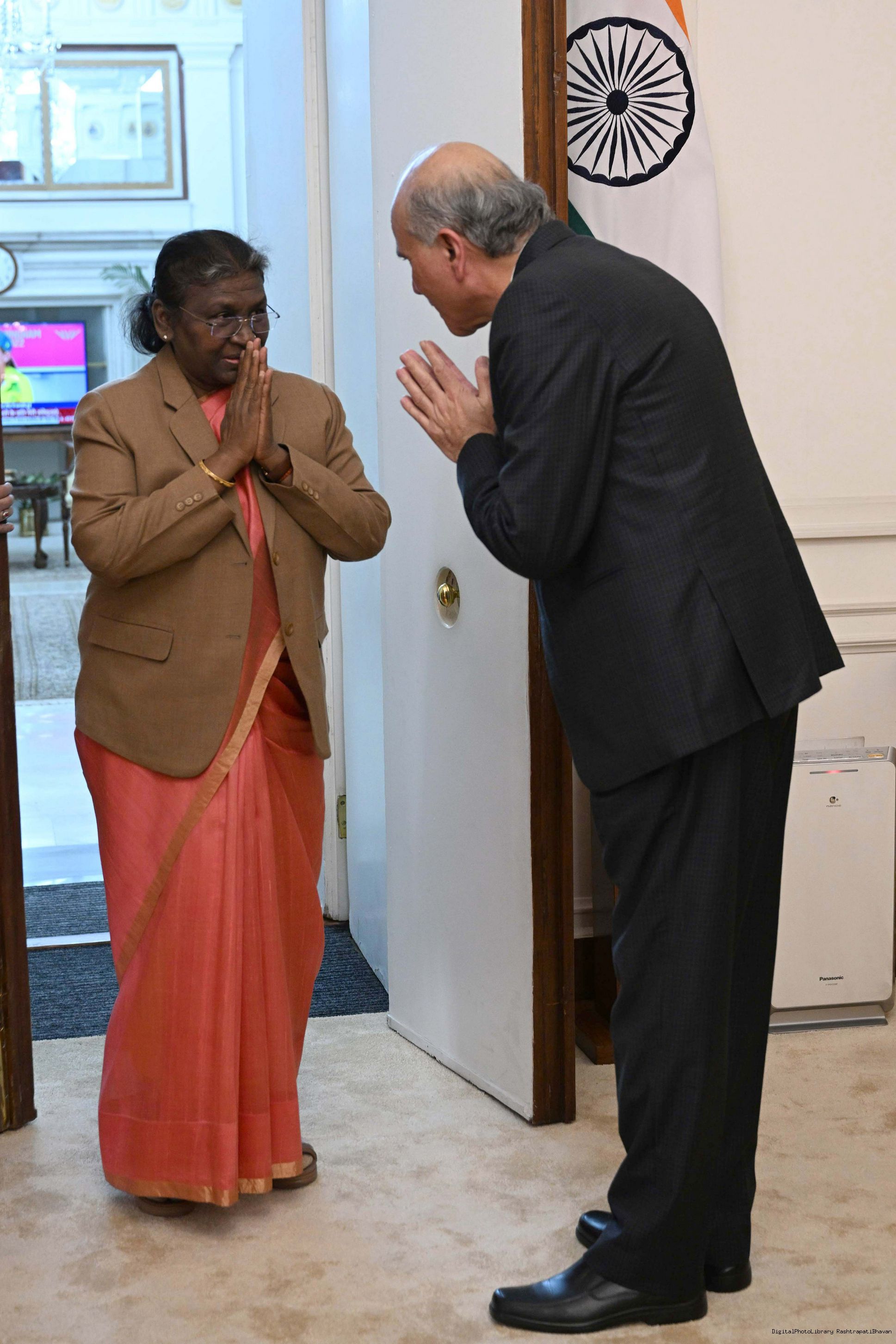 Shri S.M. Khan, Vice President, India Islamic Cultural Centre former Press Secretary to the President along with his family meeting with the President of India, Smt. Droupadi Murmu, at Rashtrapati Bhavan on Dec 23, 2022.