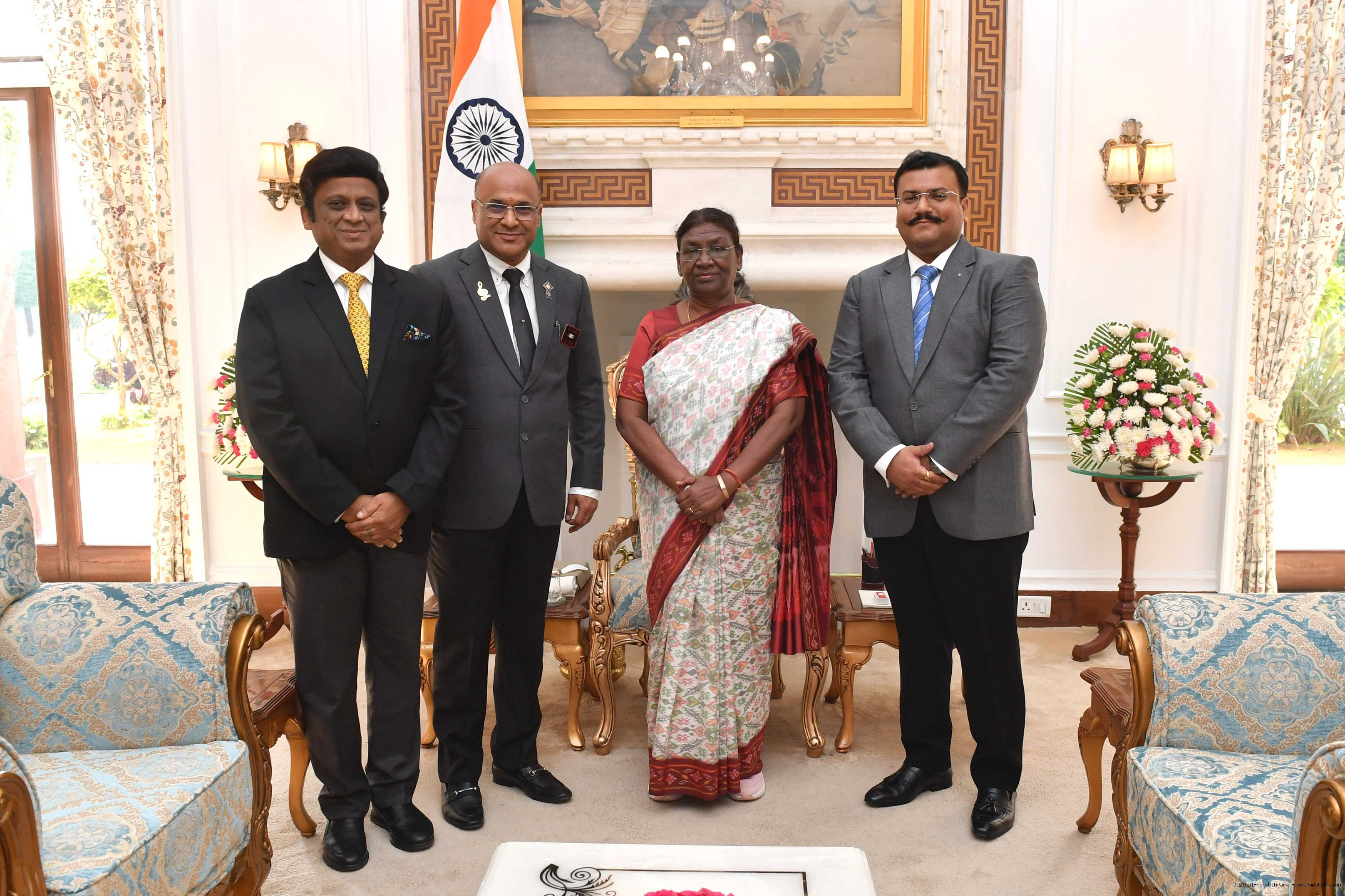 Shri SP Bagaria from Rairangpur along with others others meeting with the President of India, Smt. Droupadi Murmu at Rashtrapati Bhavan on September 22, 2023.