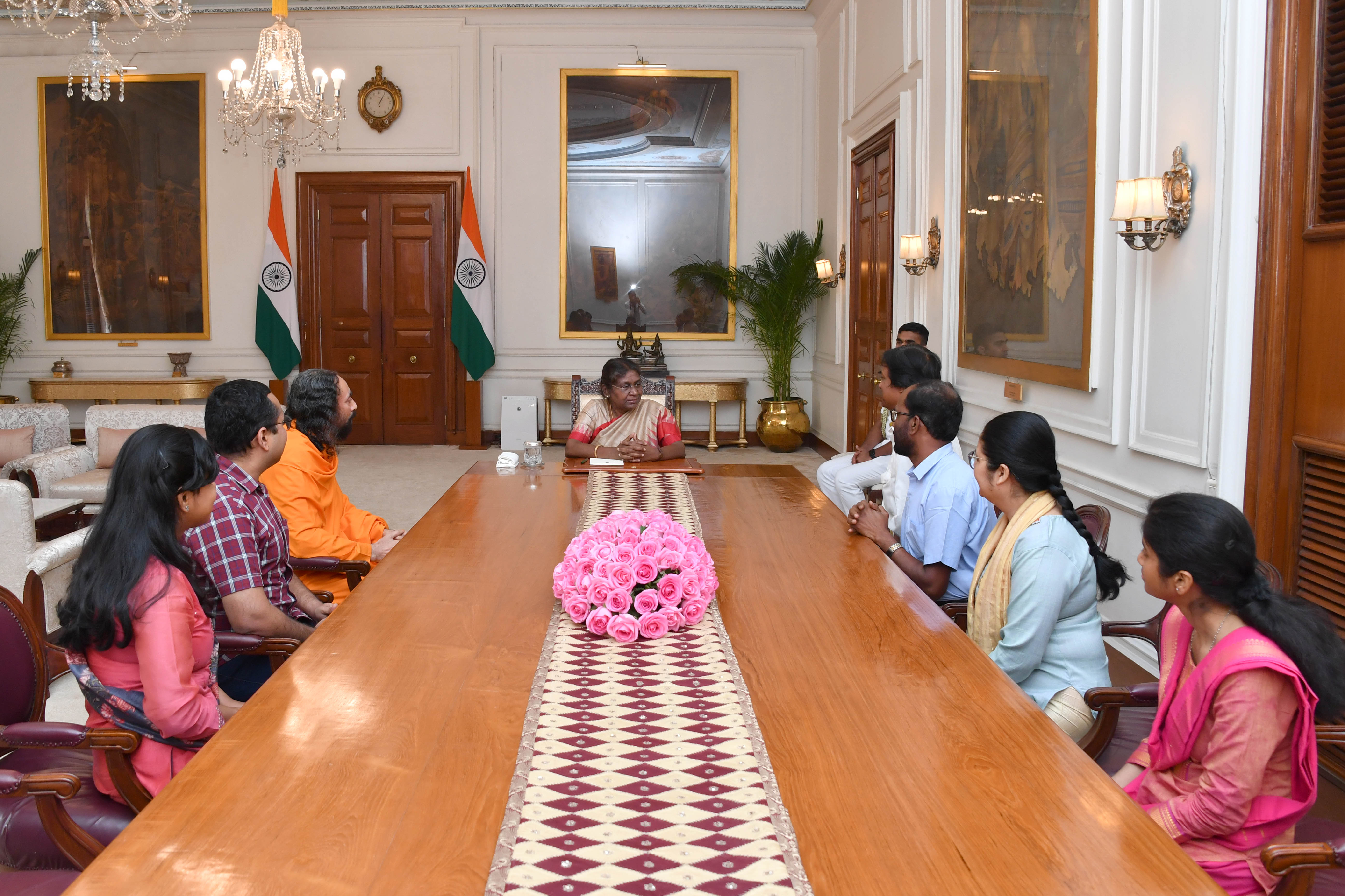 Shri Sailesh Kumar Singha, Principal-Rairangpur I.T.I Member Jagadguru Kripalu Yog Trust along with others meeting with the President of India Smt. Droupadi Murmu at Rashtrapati Bhavan on April 10, 2023.