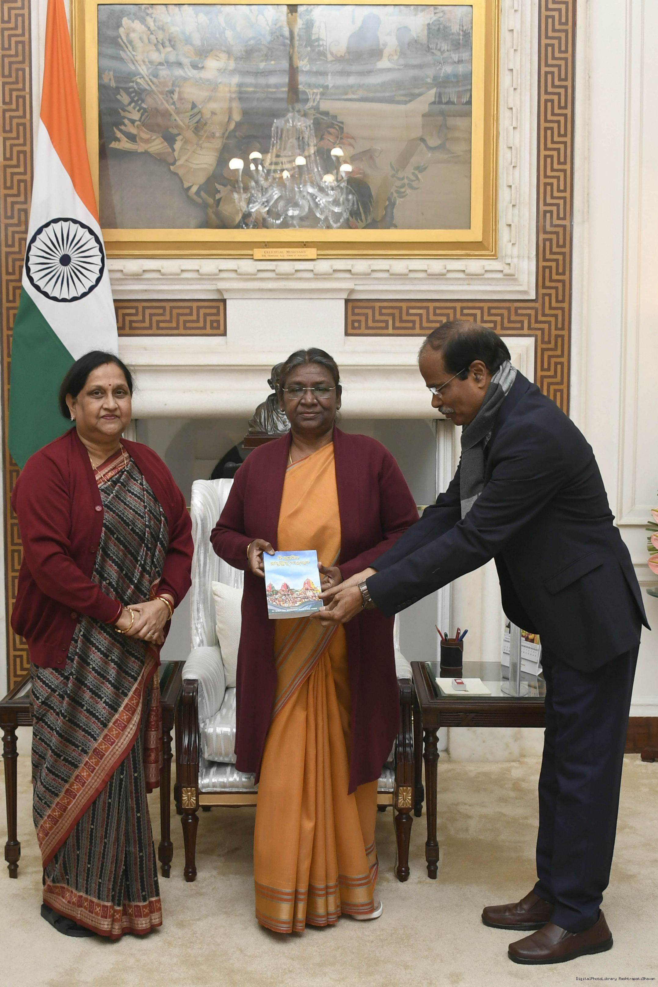 Smt. Sandhya Pattnaik along with her husband meeting with the President of India Smt. Droupadi Murmu at Rashtrapati Bhavan on February 02, 2023.