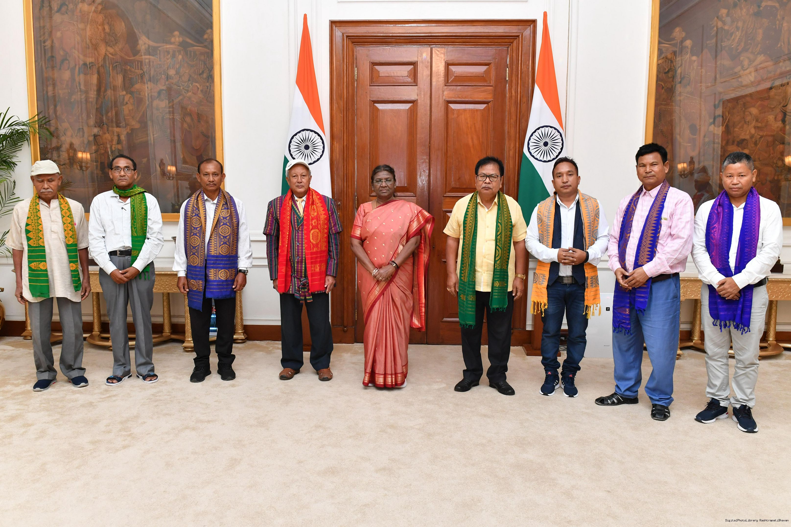 Shri Sansuma Khunggur Bwiswmuthiary, Ex- MP (LS), Chairman Bodoland Peoples' Committee on the Delimitation of the LACs and HPCs in BTAD, Assam along with 12 others meeting with the President of India, Smt. Droupadi Murmu at Rashtrapati Bhavan on June 26, 2023.
