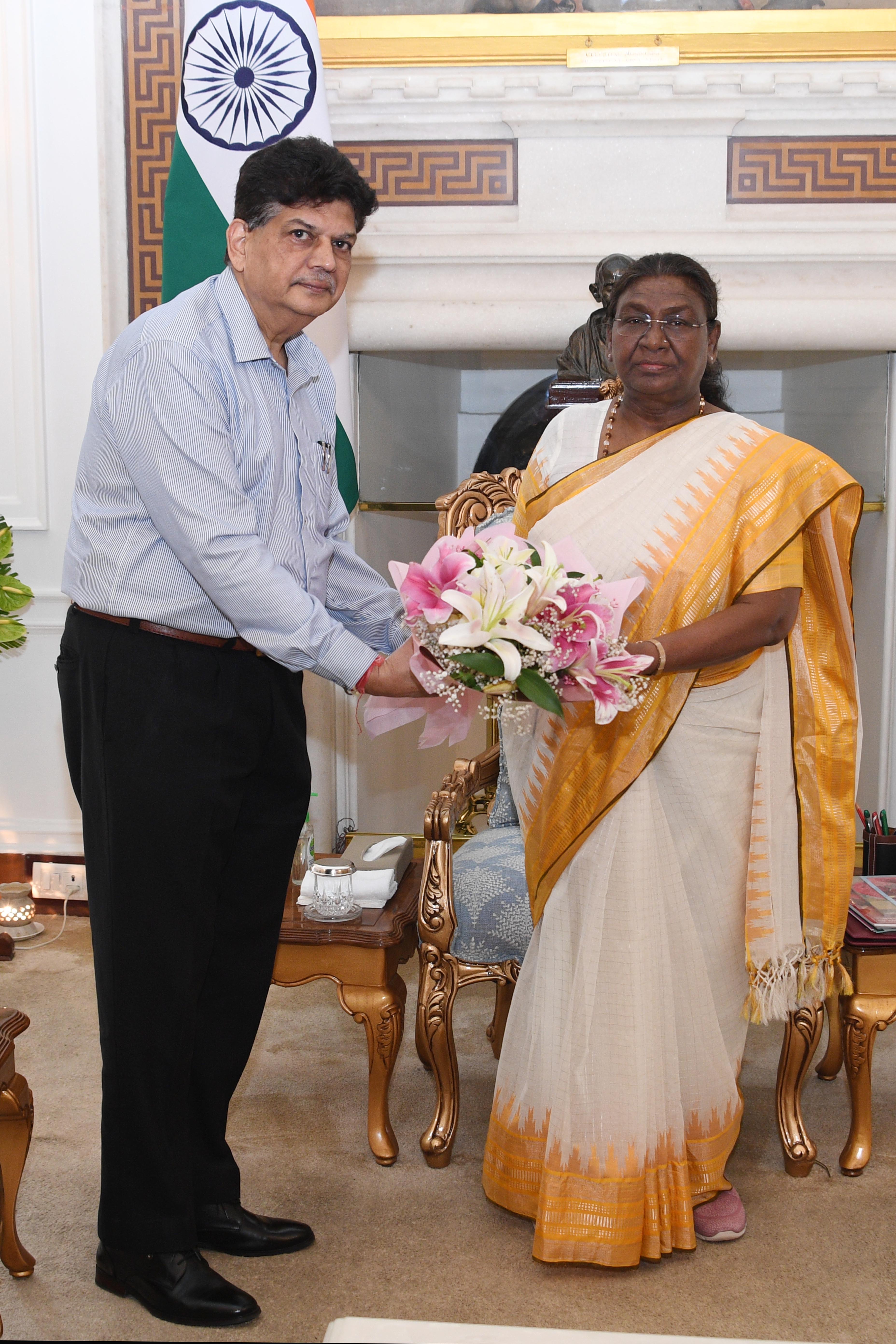 Prof. (Dr.) Sharad K. Yadav, Vice- Chancellor, Aryabhatta Knowledge University, Patna meeting with the President of India Smt. Droupadi Murmu at Rashtrapati Bhavan on Jun 25, 2024.
