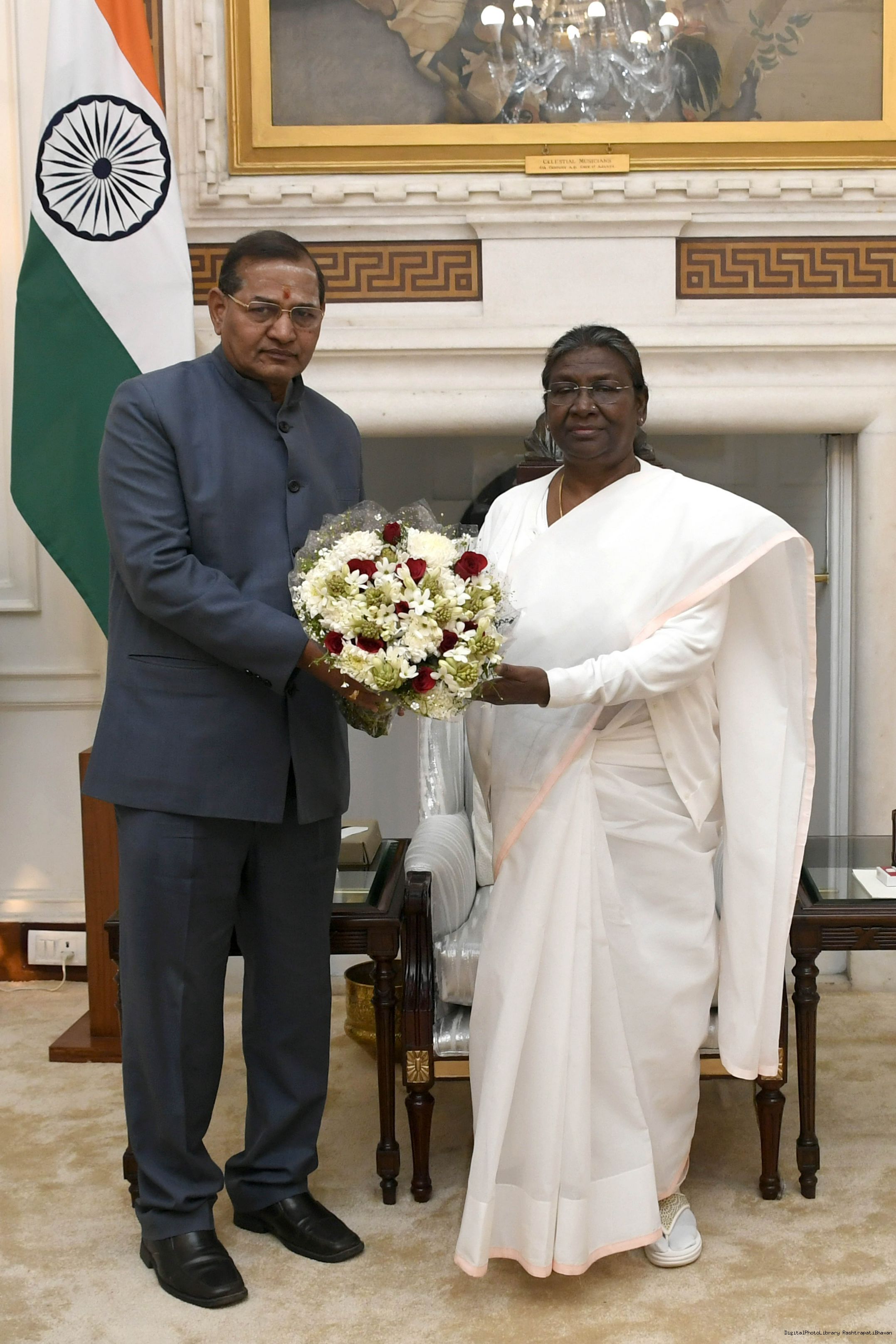 Prof. Sharanappa V. Halsa, Vice-Chancellor, Karnataka State Open University, Mysuru meeting with the President of India, Smt. Droupadi Murmu, at Rashtrapati Bhavan on Dec 13, 2022.