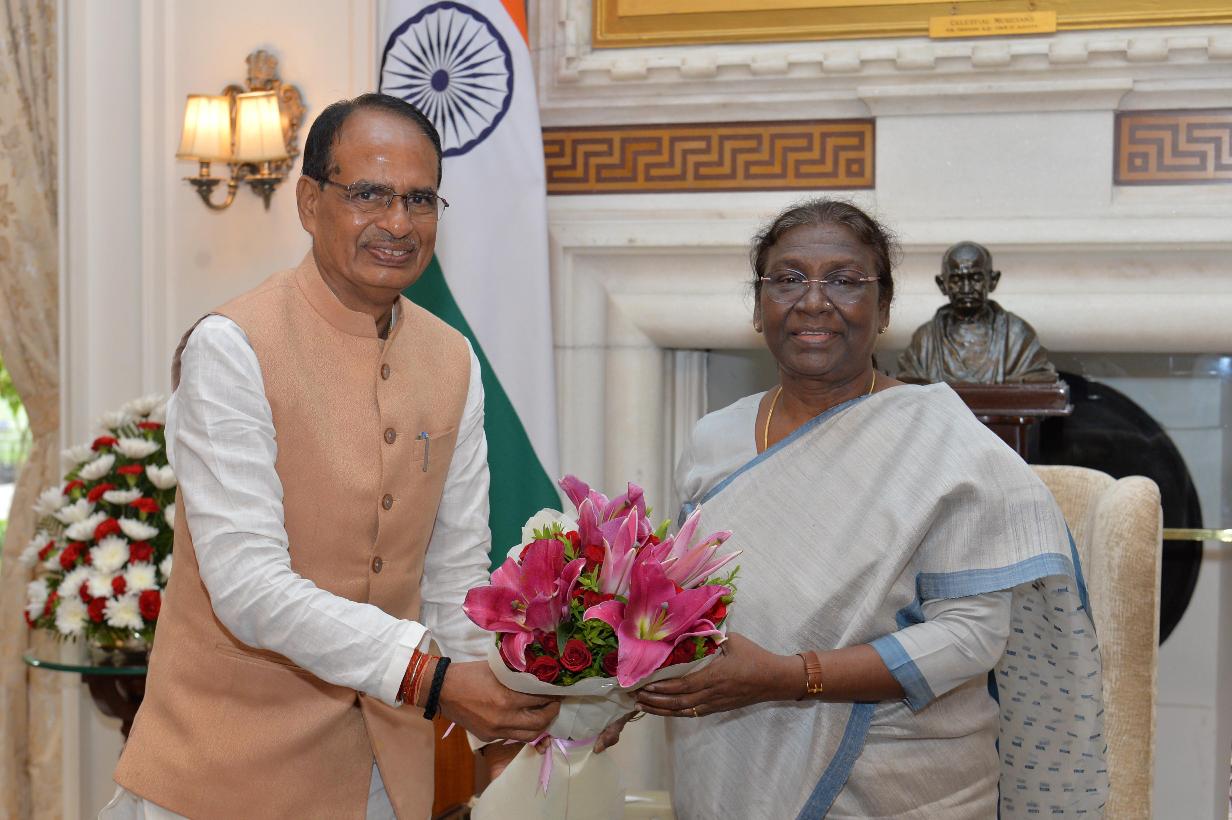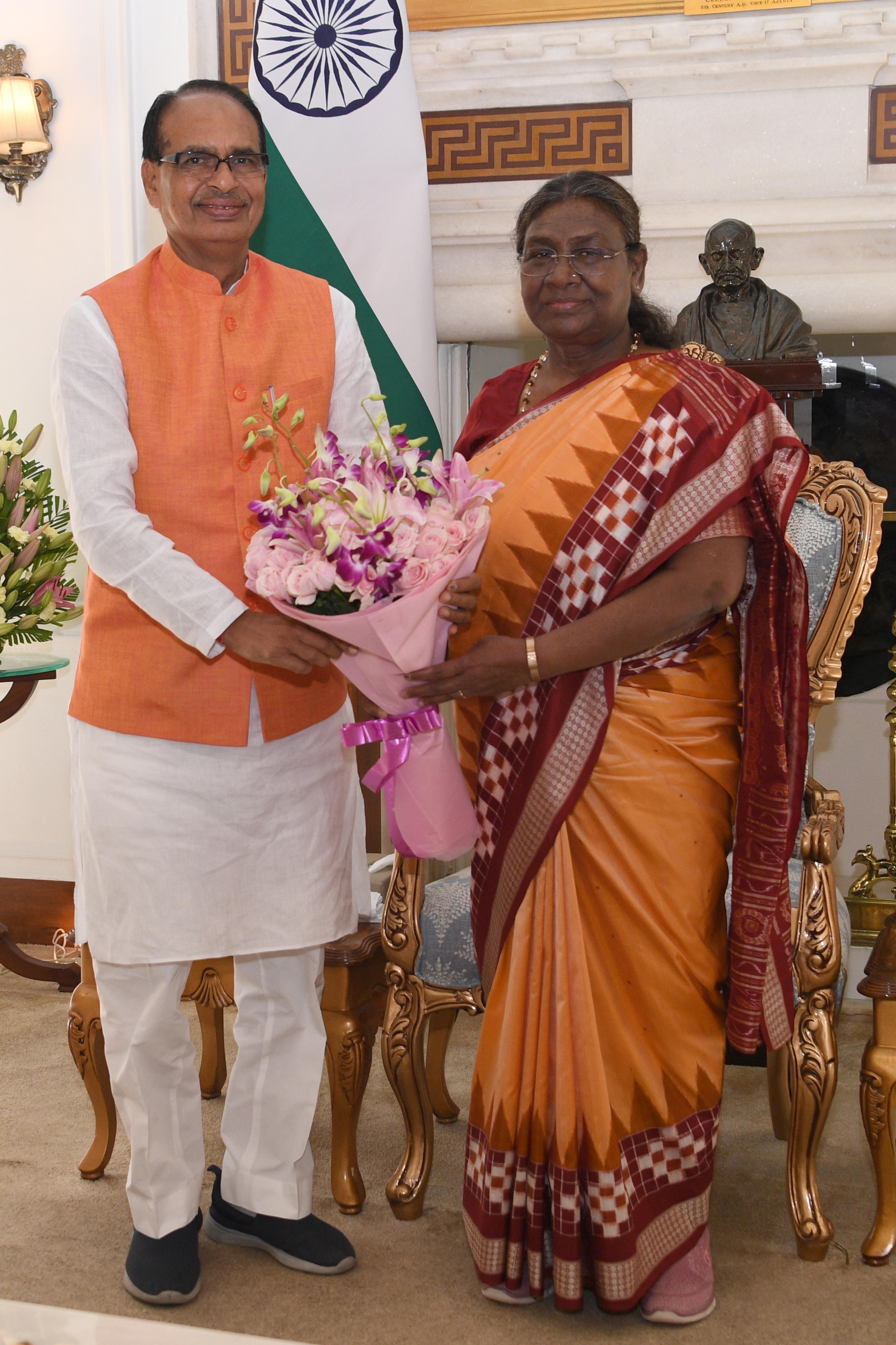The Chief Minister of Madhya Pradesh, Shri Shivraj Singh Chouhan calling on the President of India, Smt. Droupadi Murmu, at Rashtrapati Bhavan on August 30, 2022.