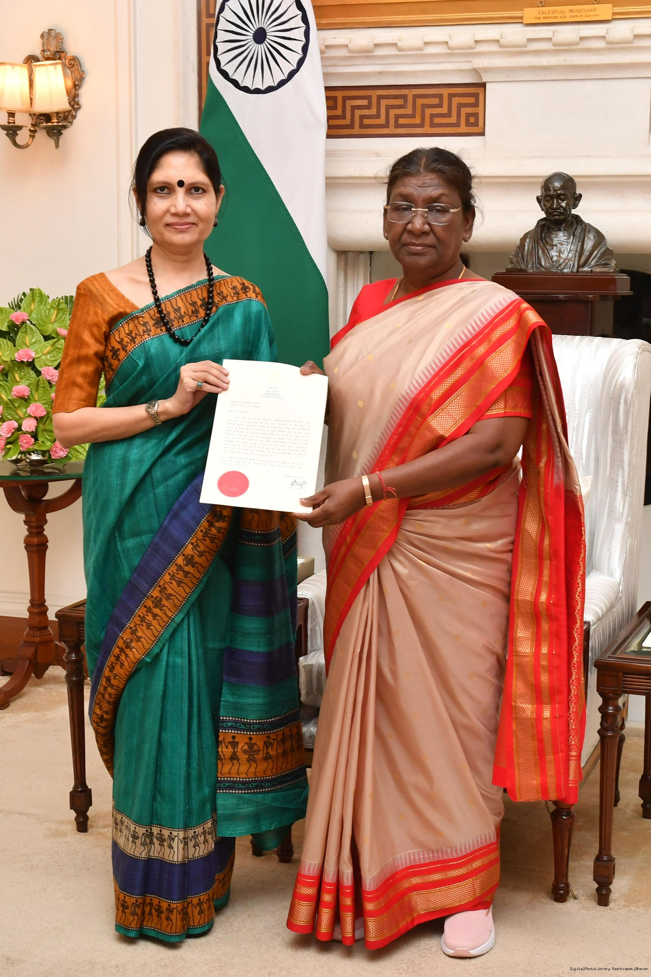 The Ambassador-designate of India to Serbia, Ms. Shubhdarshini Tripathi meeting with the President of India, Smt. Droupadi Murmu at Rashtrapati Bhavan on August 10, 2023.