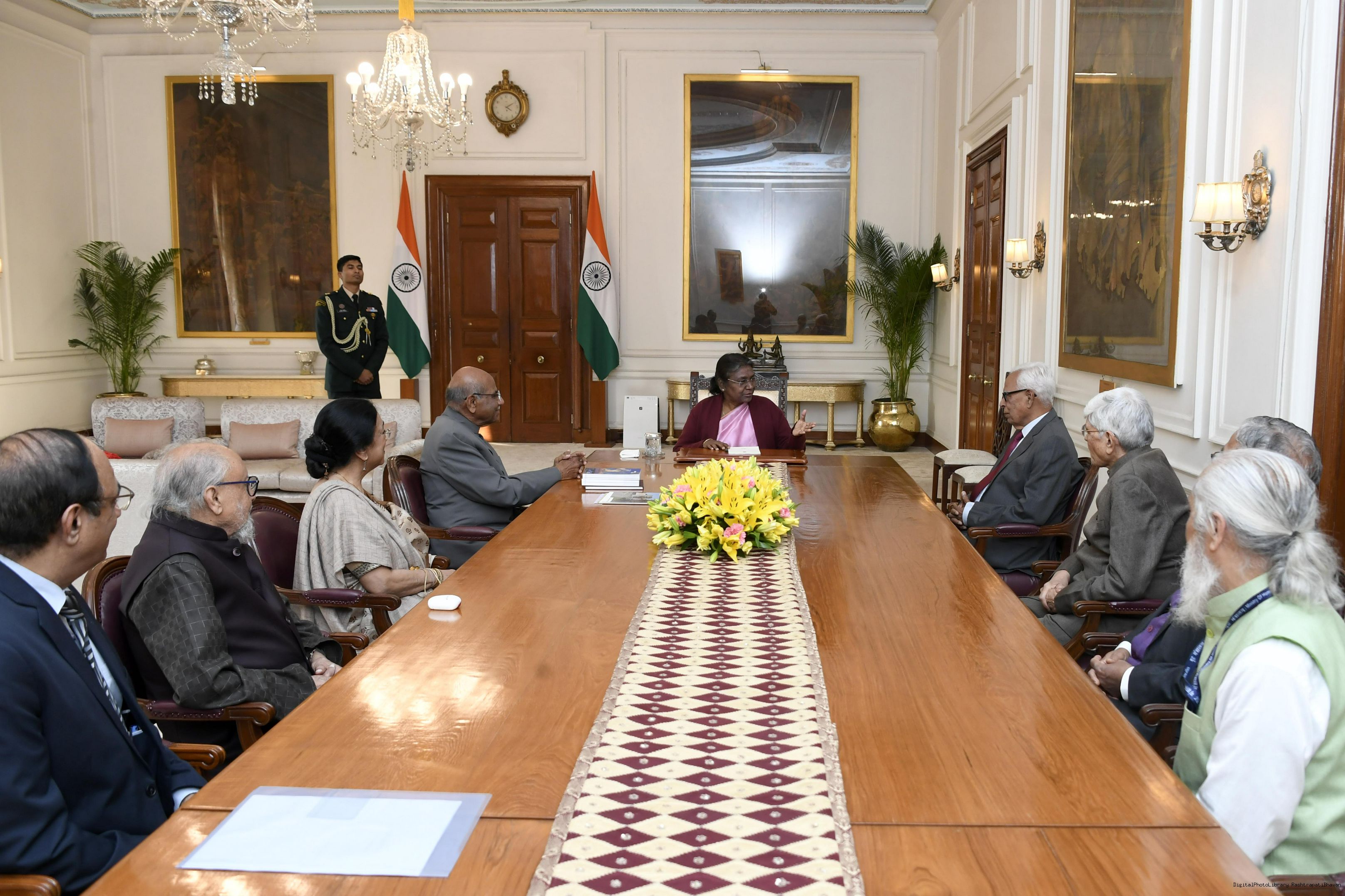 Shri Shyam Saran, President along with others from India International Centre (IIC) meeting with the President of India Smt. Droupadi Murmu at Rashtrapati Bhavan on February 08, 2023.