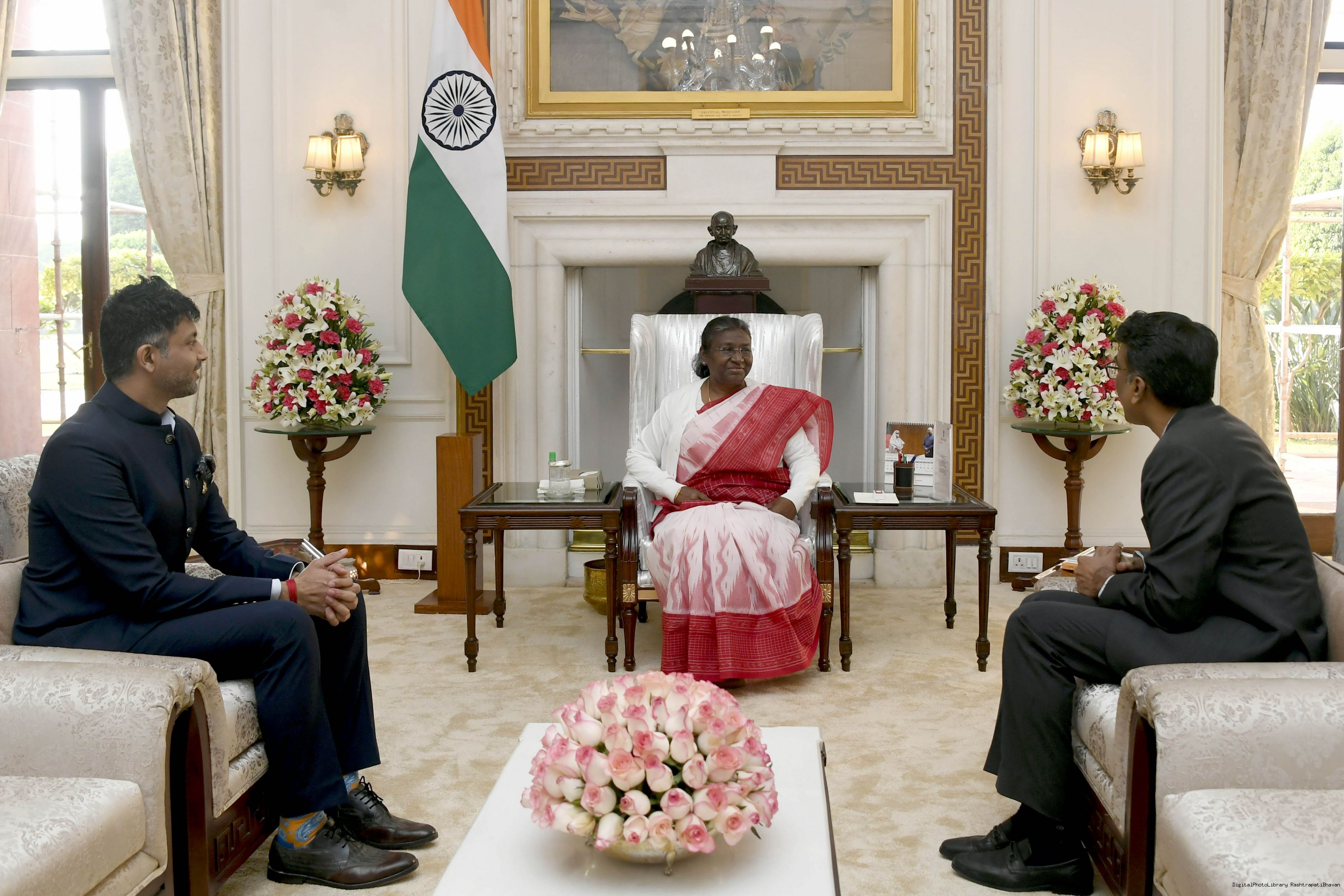 Shri Soham Misra from Rairangpur, Odisha, Member - Executive Committee, Federation of Automobile Dealers Associations (FADA), New Delhi meeting with the President of India, Smt. Droupadi Murmu, at Rashtrapati Bhavan on Dec 12, 2022.