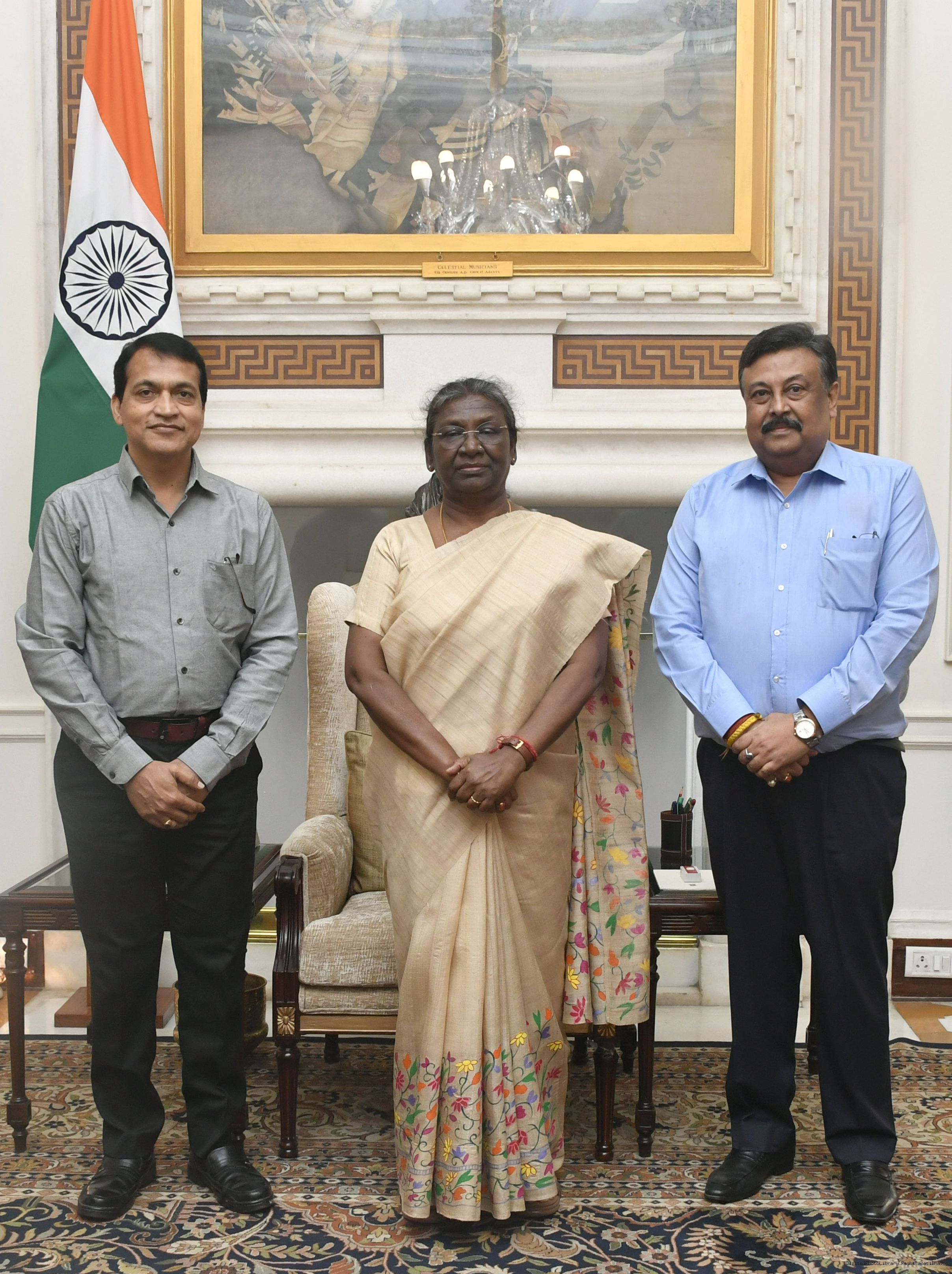 Shri Subrat Mishra and Shri Saugata Mitra from Rairangpur meeting with the President of India, Smt. Droupadi Murmu, at Rashtrapati Bhavan on Nov 08, 2022.