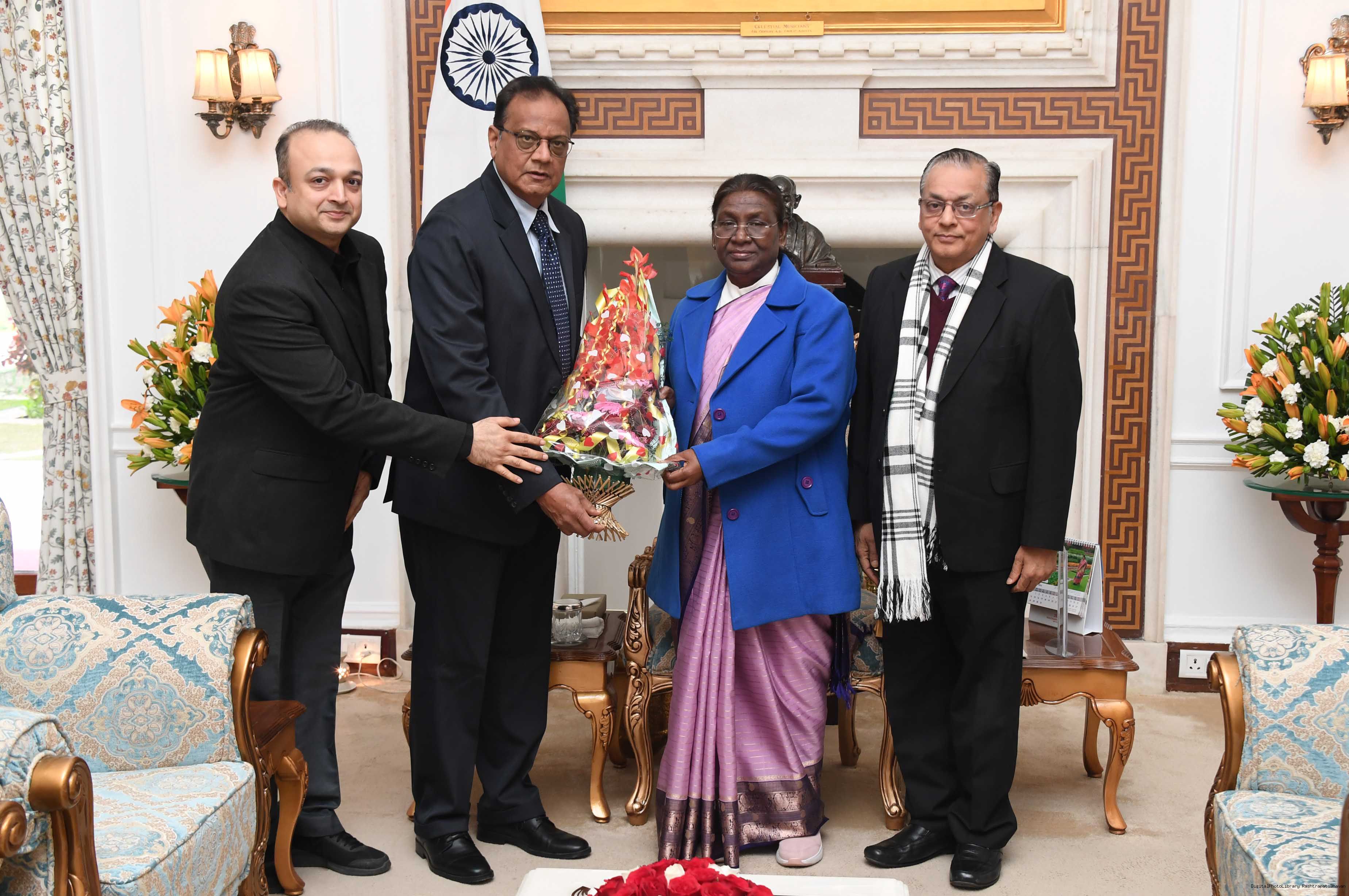 Dr. Sudhir Kumar Rawal, Medical Director Chief Urogential Oncology, Rajeev Gandhi Cancer Institute Research Centre along with others meeting with the President of India, Smt. Droupadi Murmu at Rashtrapati Bhavan on January 12, 2024.