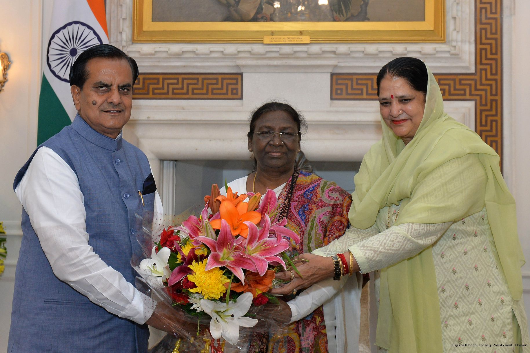 Shri Sukhbir Singh Jaunapuria, MP (LS) along with others meeting with the President of India, Smt. Droupadi Murmu, at Rashtrapati Bhavan on July 27, 2022.
