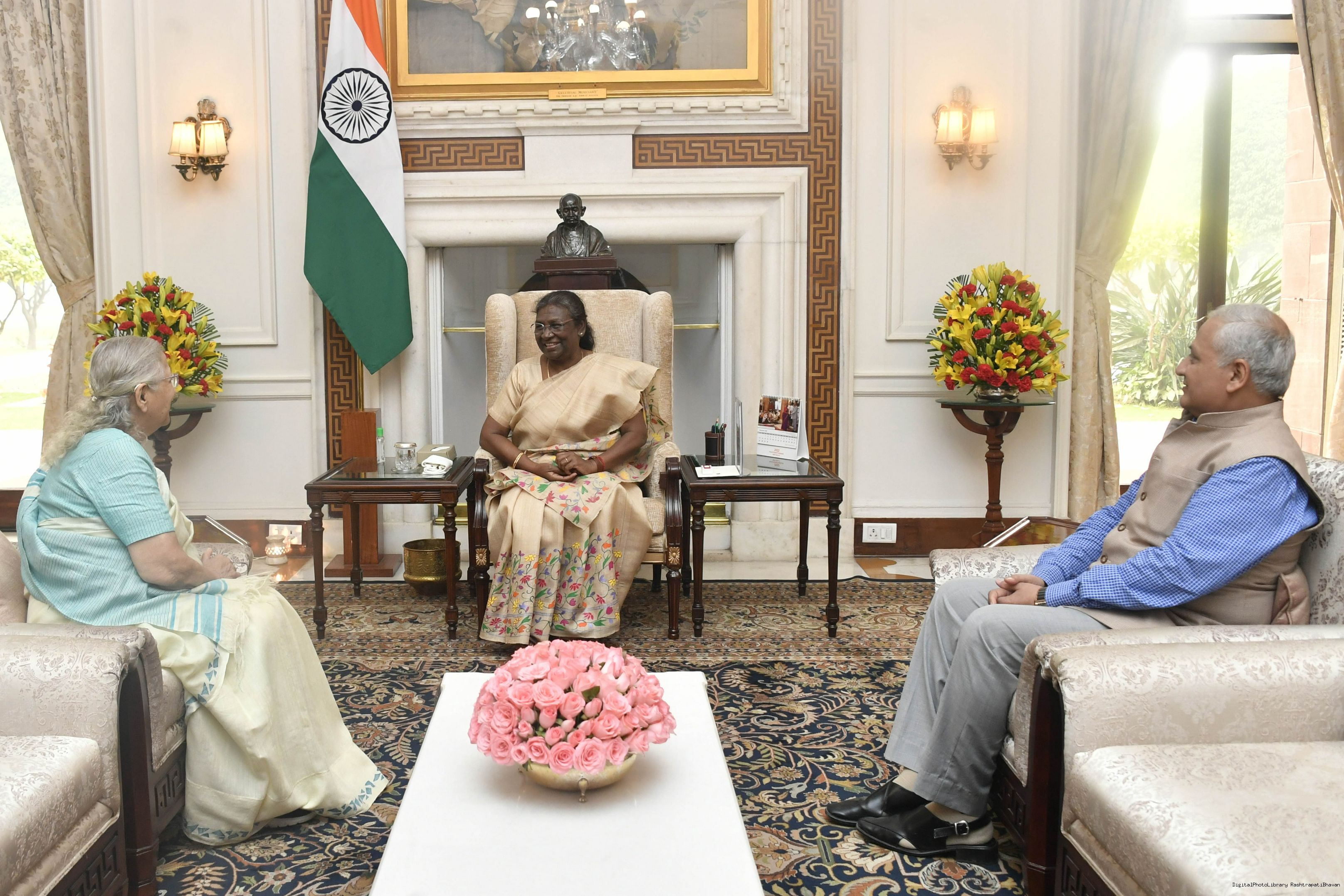 Smt. Sumitra Mahajan, former Speaker, Lok Sabha along with her son Shri Milind Mahajan meeting with the President of India, Smt. Droupadi Murmu, at Rashtrapati Bhavan on Nov 08, 2022.