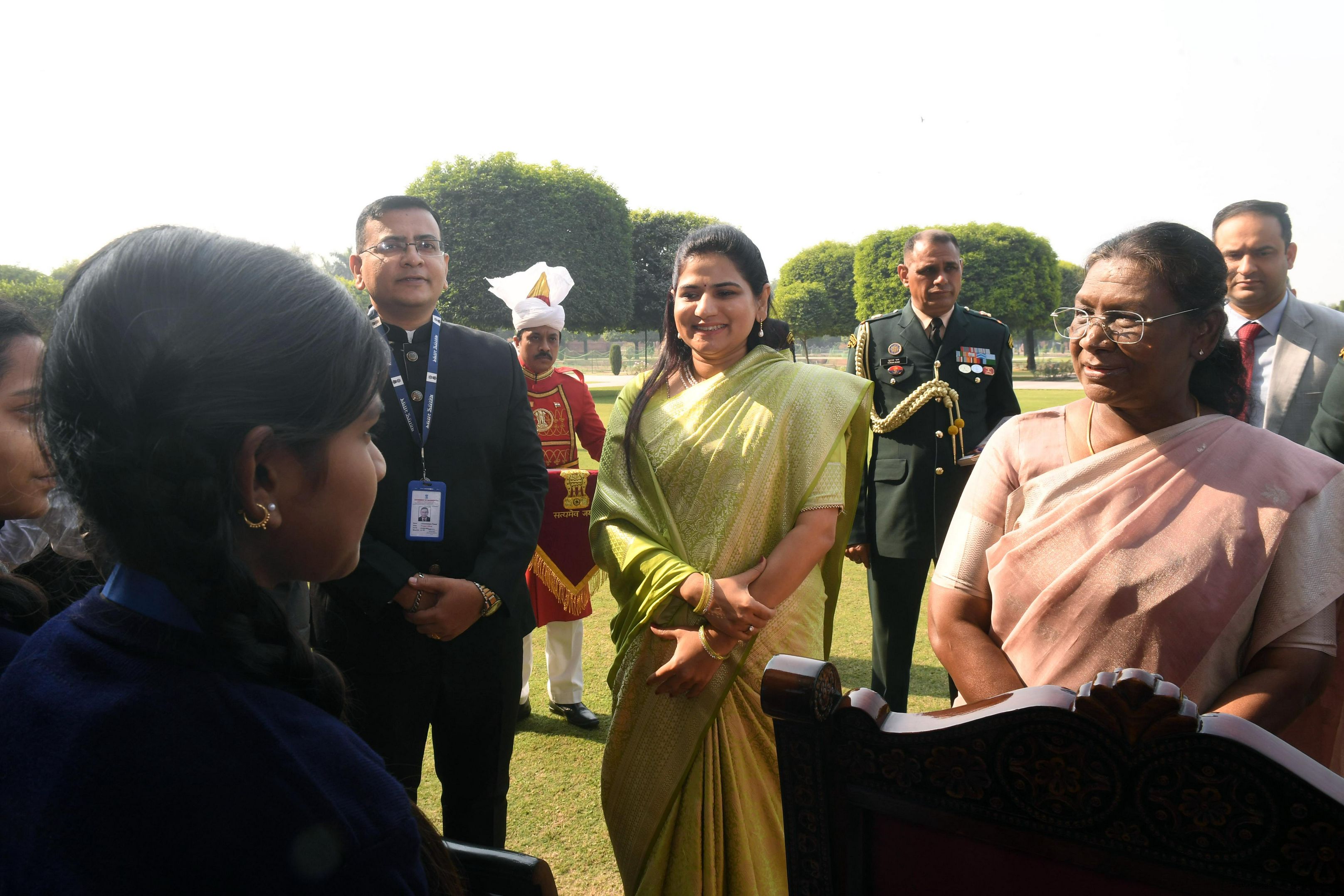 The President of India, Smt. Draupadi Murmu meeting and posing for a photograph with a 49-person group comprising Shri Sunil Pandurang Londhe, 13 others and 35 students at Rashtrapati Bhavan on December 9, 2024.