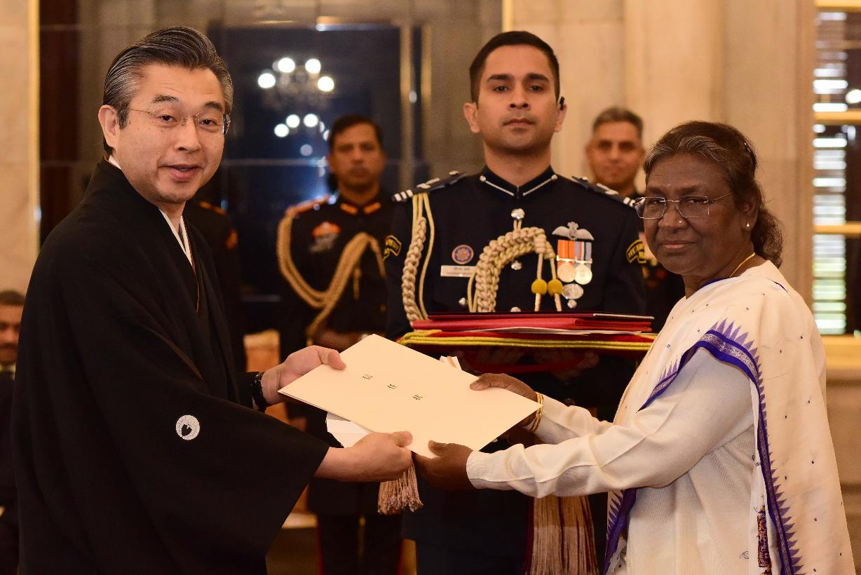 The Ambassador-designate of Japan, H.E. Mr. Suzuki Hiroshi presenting his credentials to the President of India, Smt. Droupadi Murmu, at Rashtrapati Bhavan on November 28, 2022.