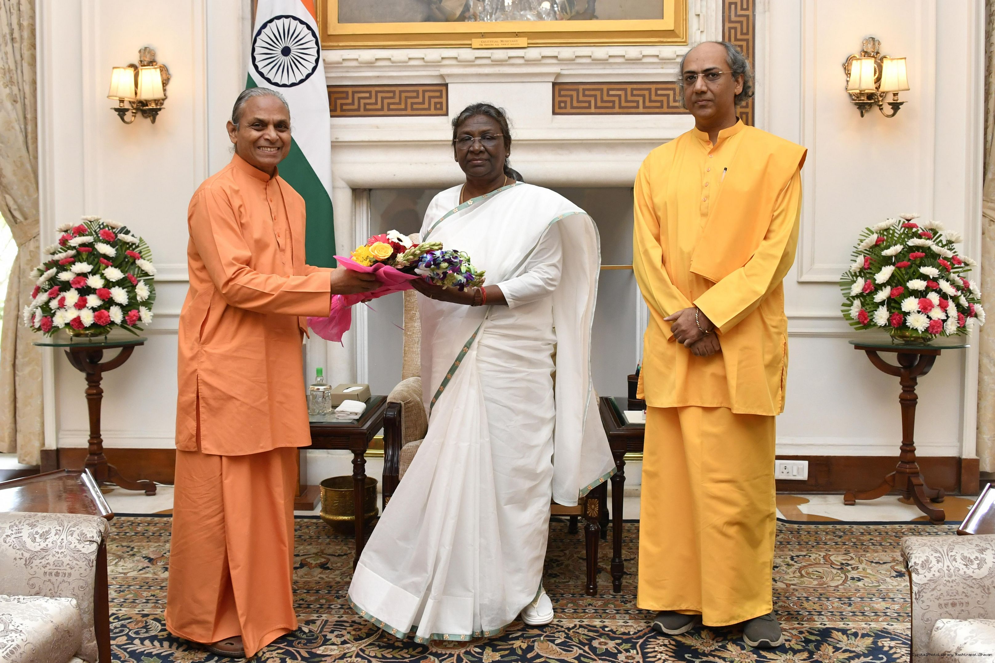 Swami Smaranananda Giri, Vice-President, Swami Ishwarananda Giri, General Secretary, Yogoda Satsanga Society and Br. Adyananda, Ashram In-Charge, Yogoda Satsanga Sakha Ashram Noida meeting with the President of India, Smt. Droupadi Murmu, at Rashtrapati Bhavan on Nov 09, 2022.