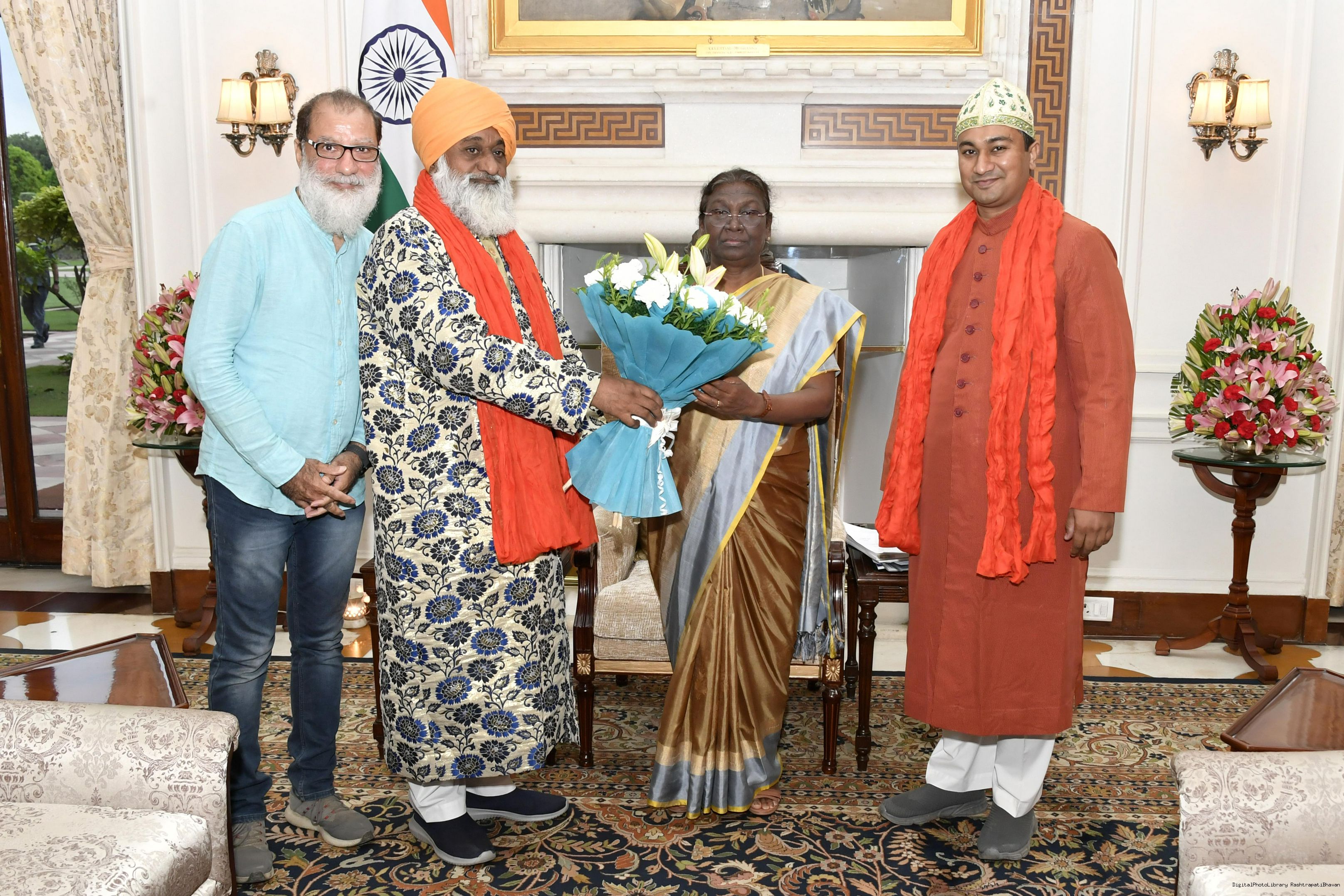 Syed Fakhar Kazmi Chishty from Dargah Sharif, Ajmer along with his son Syed Ragib Chishty and Adlib Farig meeting with the President of India, Smt. Droupadi Murmu, at Rashtrapati Bhavan on Sep 14, 2022.