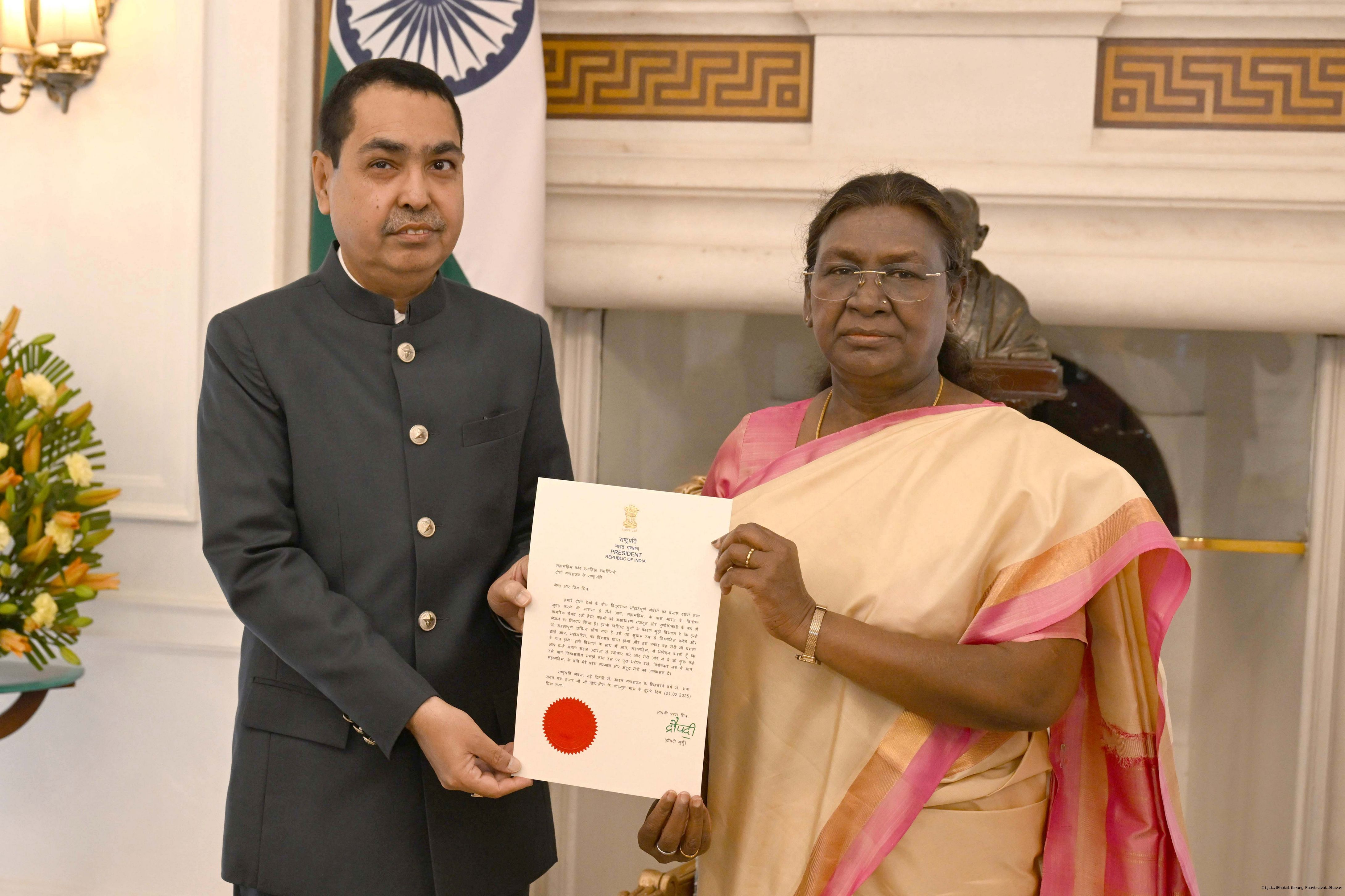 The Ambassador-designate of India to the Republic to Togo, Shri Syed Razi Haider Fahmi meeting with the President of India, Smt. Droupadi Murmu at Rashtrapati Bhavan on March 7, 2025.