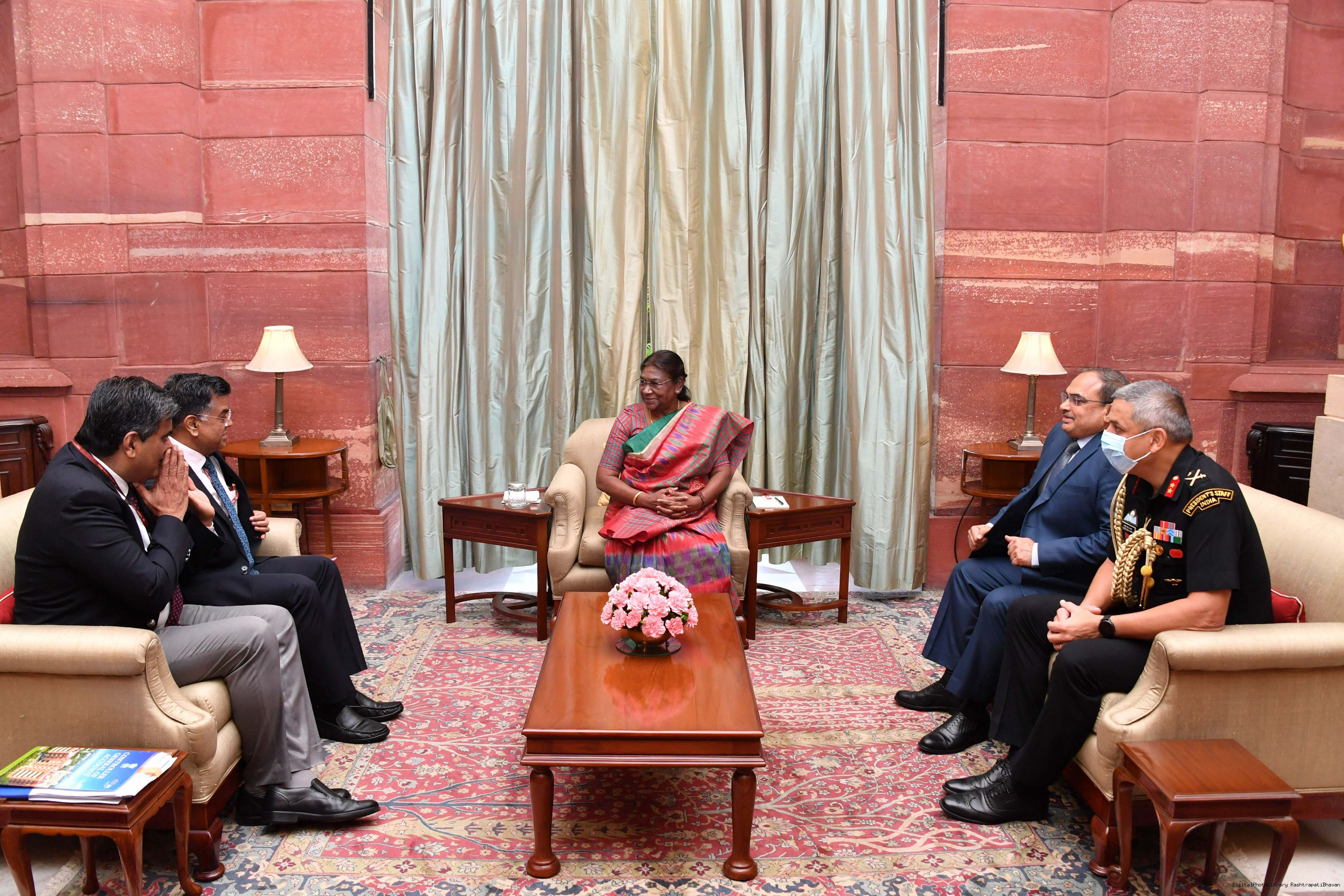 Shri T.V. Somanathan, Finance Secretary, Shri Shyam S. Dubey, Controller General of Accounts (CGA) along with Secretary to the President and Military Secretary to the President meeting with the President of India Smt. Droupadi Murmu at Rashtrapati Bhavan on April 25, 2023.