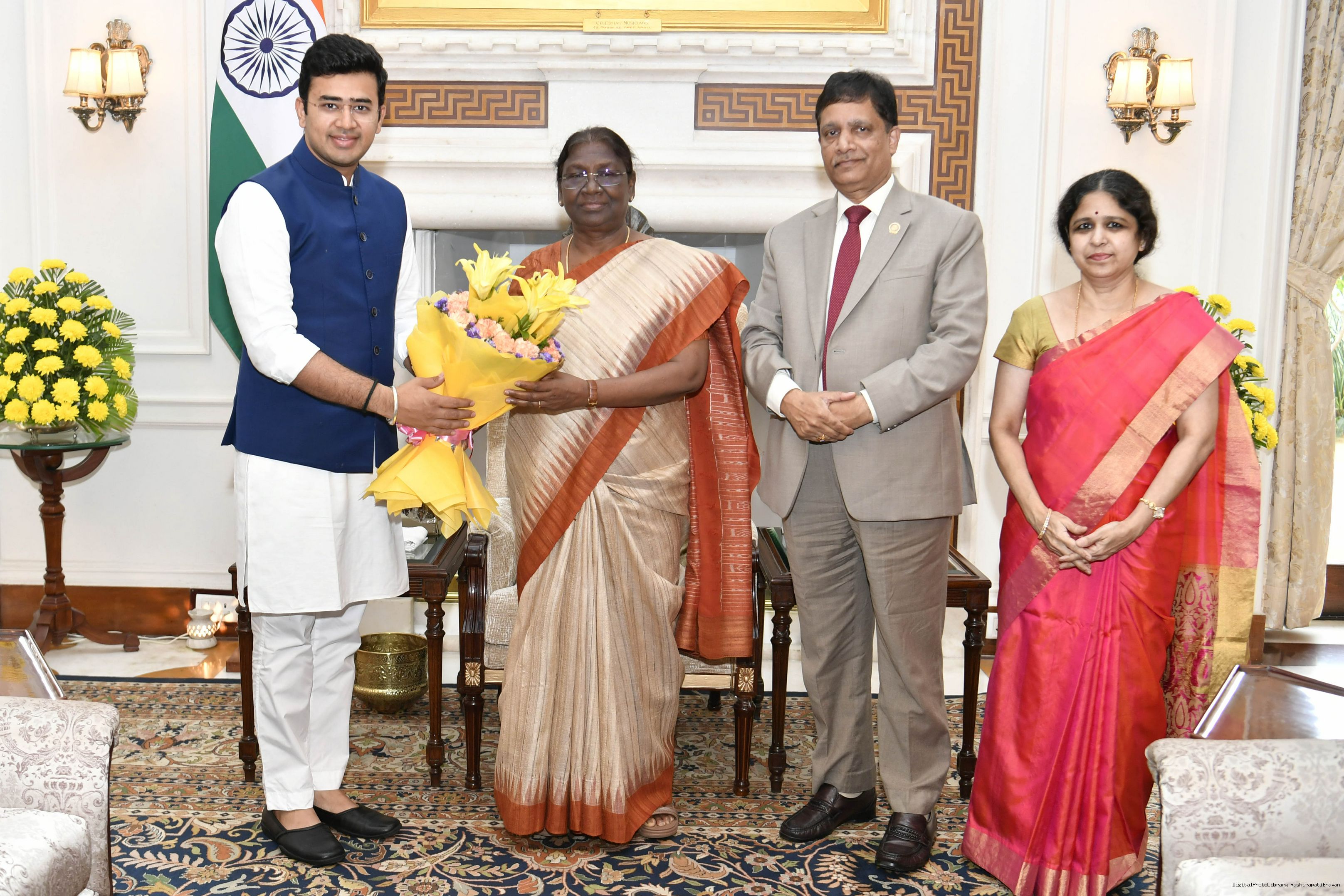 Shri Tejasvi Surya, MP (LS) along with Dr IS Prasad, President, Federation of Karnataka Chambers of Commerce Industry and his wife. meeting with the President of India, Smt. Droupadi Murmu, at Rashtrapati Bhavan on Aug 20, 2022.