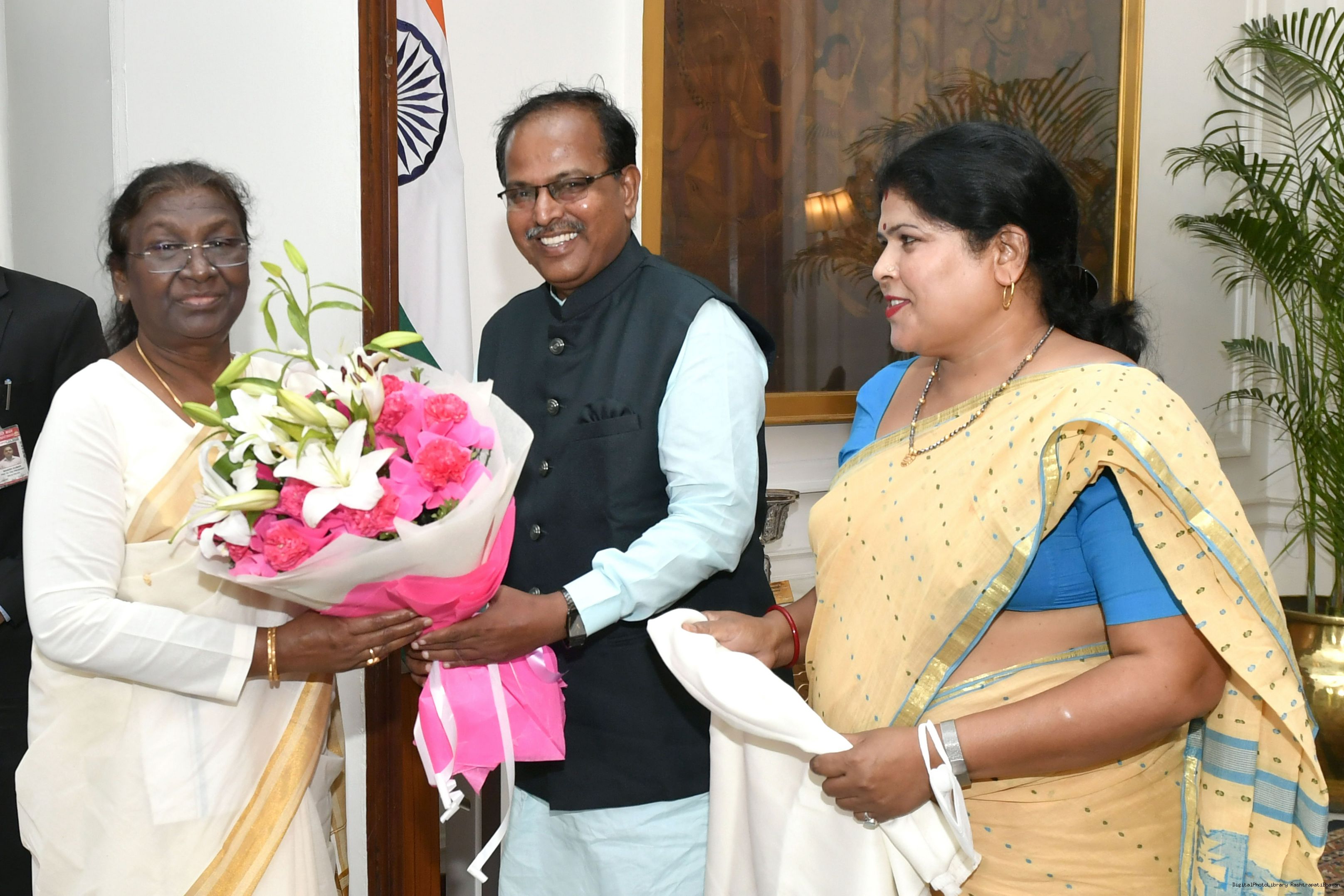 Shri Tippanna R. Koli, President along with others from Anusuchit Jati Jan Jati Sourakshana Samiti meeting with the President of India, Smt. Droupadi Murmu, at Rashtrapati Bhavan on Aug 24, 2022.