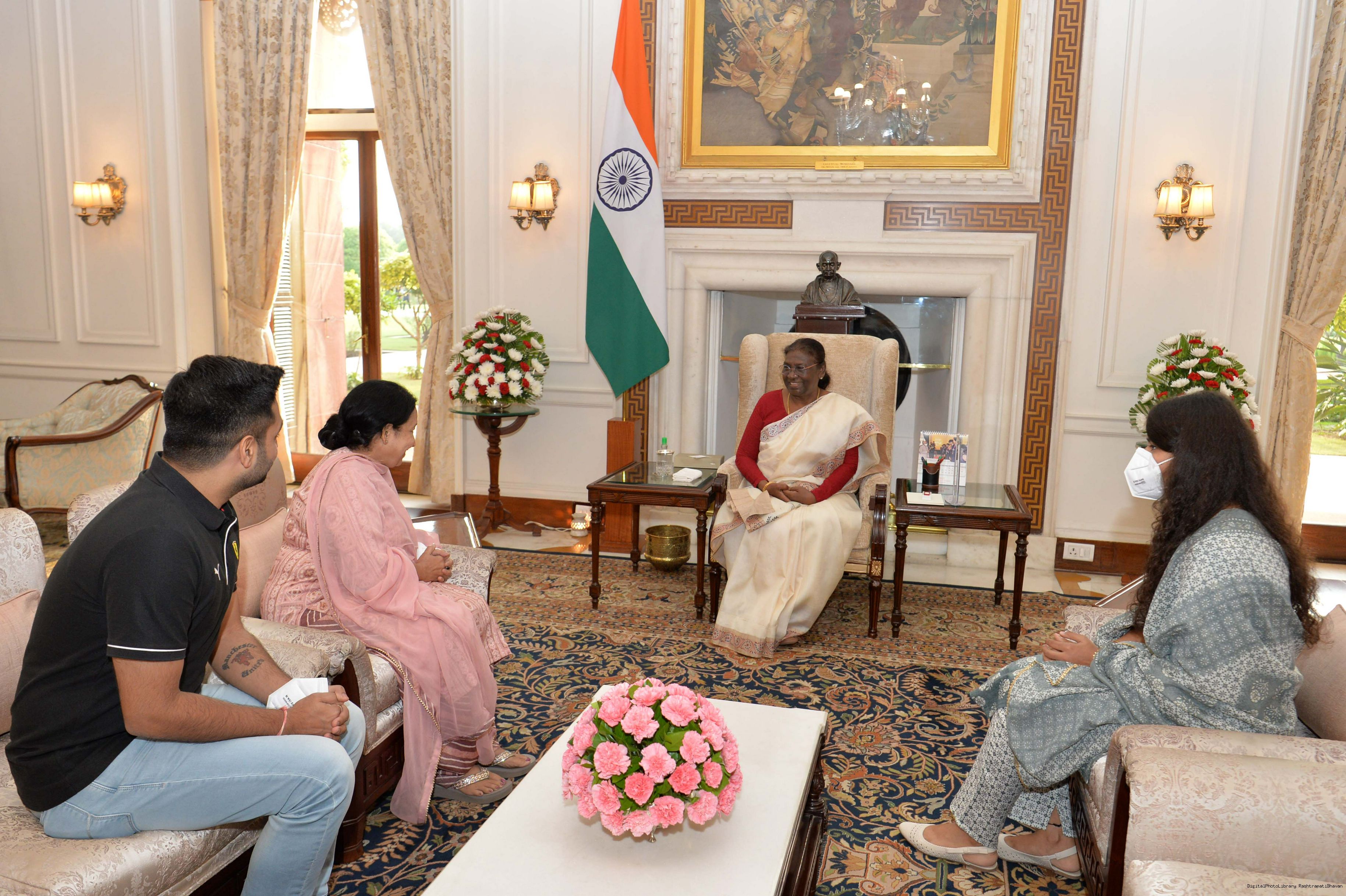 Smt. Usha Shashidharan, Under Secretary, President's Secretariat along with her family members meeting with the President of India, Smt. Droupadi Murmu, at Rashtrapati Bhavan on Aug 31, 2022.