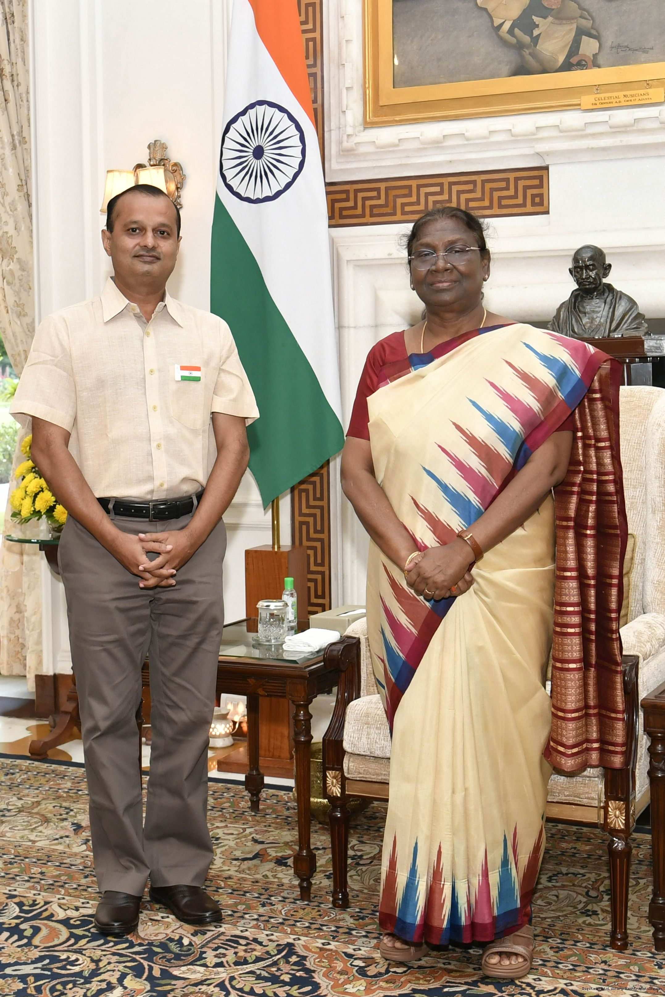 Shri Utpal Bhatt, Lokpal, MNREGA, Government of Gujarat meeting with the President of India, Smt. Droupadi Murmu, at Rashtrapati Bhavan on Aug 17, 2022.