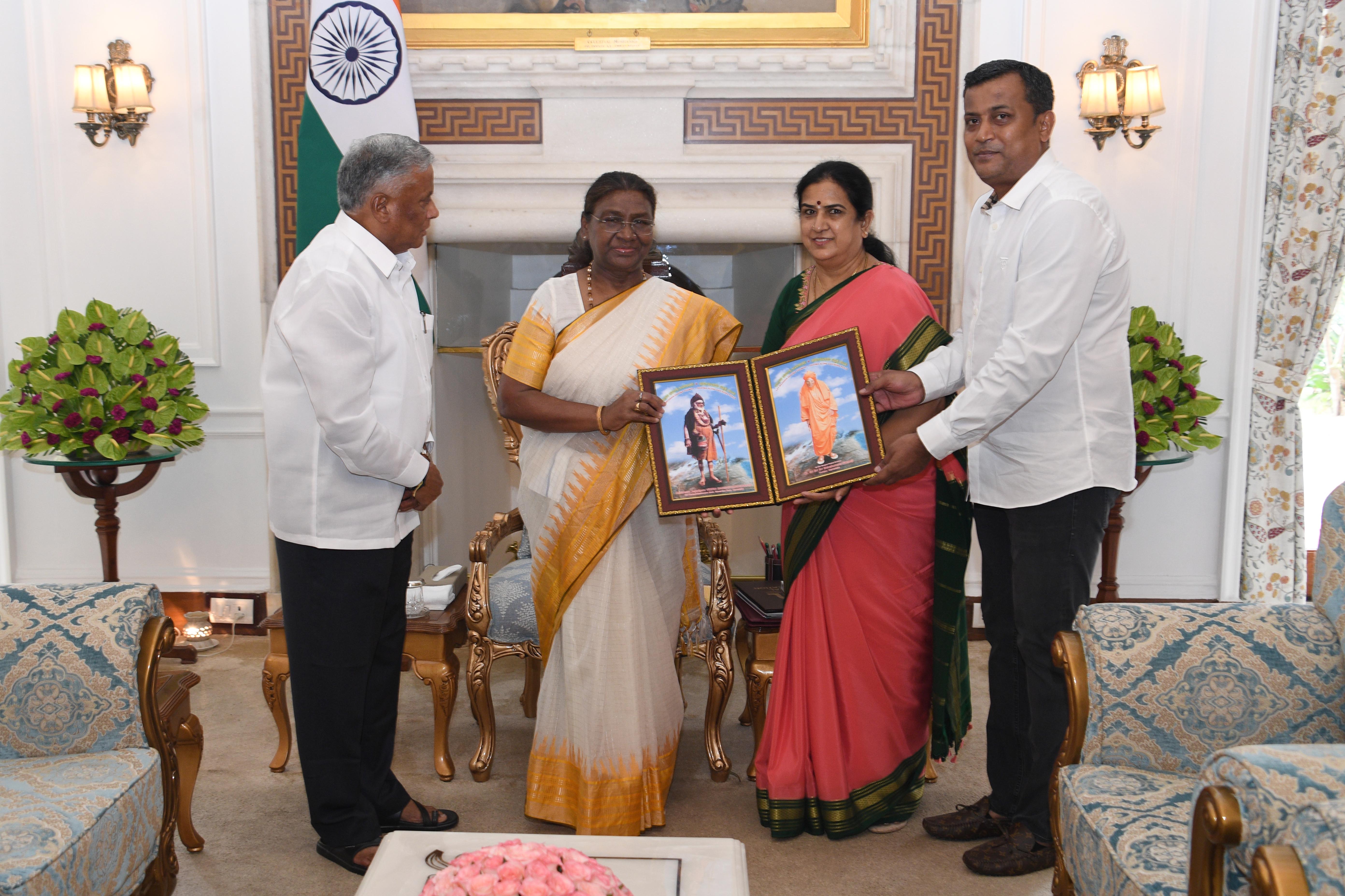 Shri V. Somanna, MoS for Railwaysand Jal Shakti along with spouse Smt. Gangadharaiash Shylaja and others meeting with the President of India, Smt. Droupadi Murmu at Rashtrapati Bhavan on September 26, 2025.