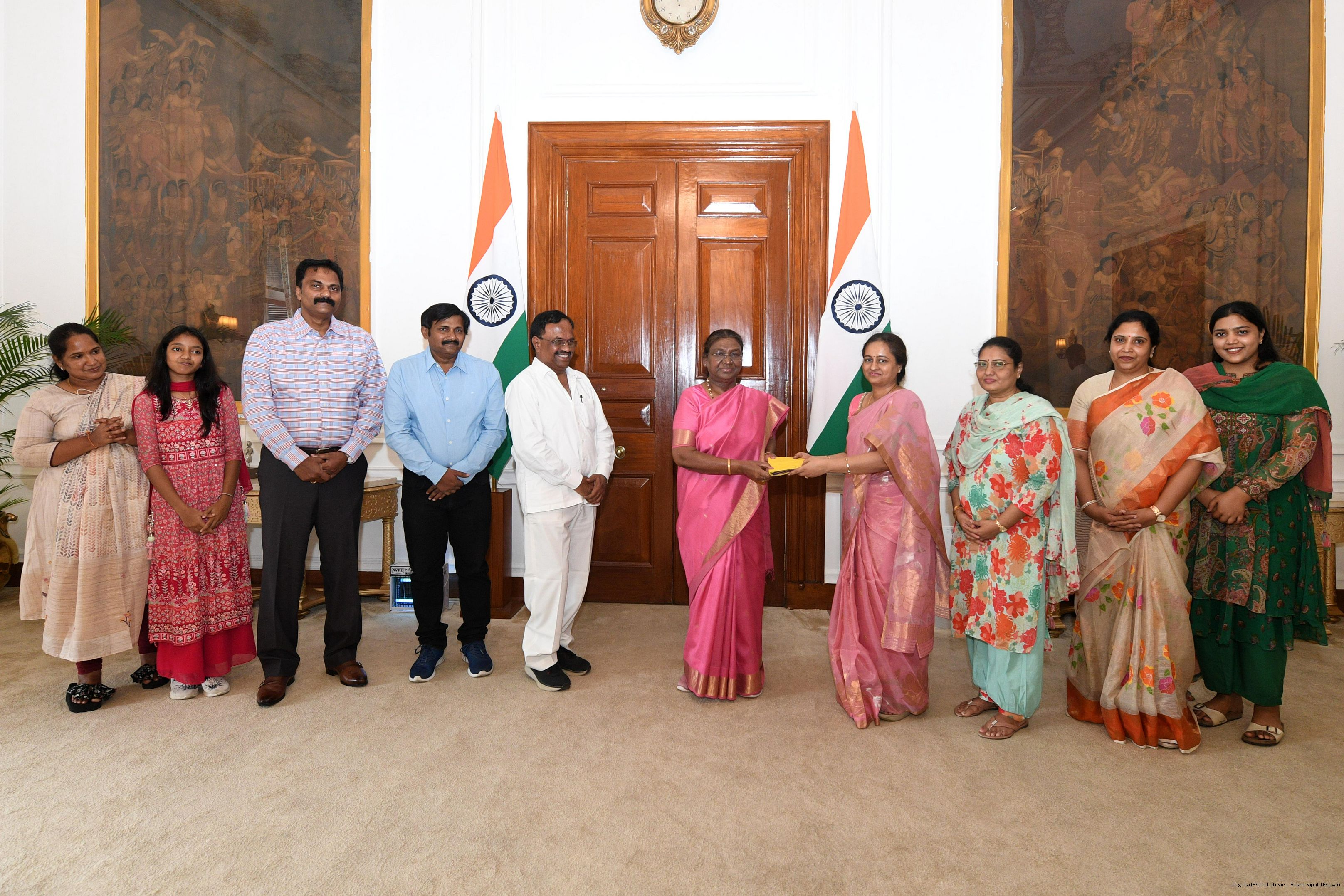 Shri V. Vijaya Raghava Reddy from Rairangpur along with others meeting with the President of India, Smt. Droupadi Murmu at Rashtrapati Bhavan on July 01, 2024.