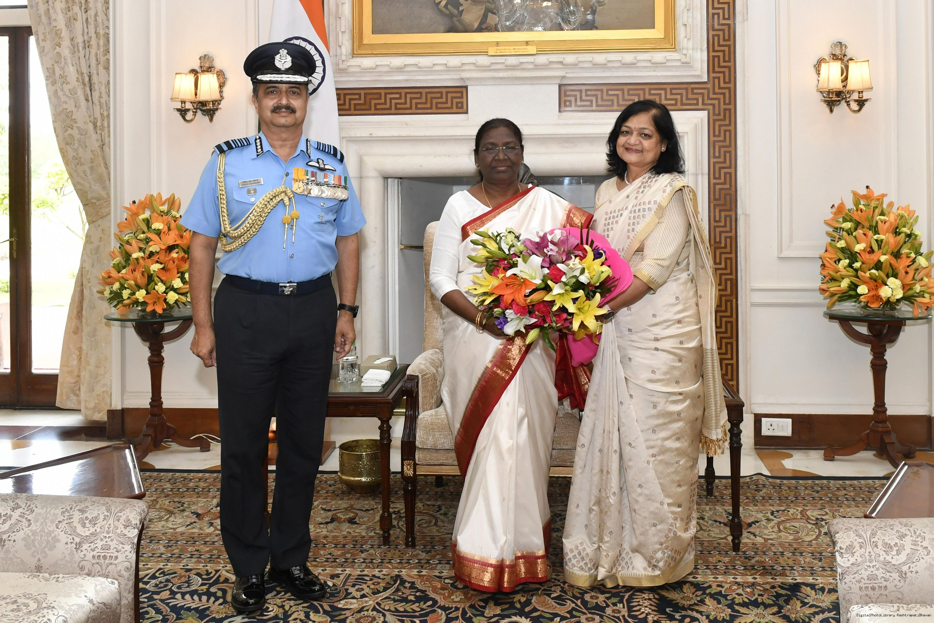 The Chief of the Air Staff, Air Chief Marshal V.R. Chaudhari calling on the President of India, Smt. Droupadi Murmu, at Rashtrapati Bhavan on August 03, 2022.