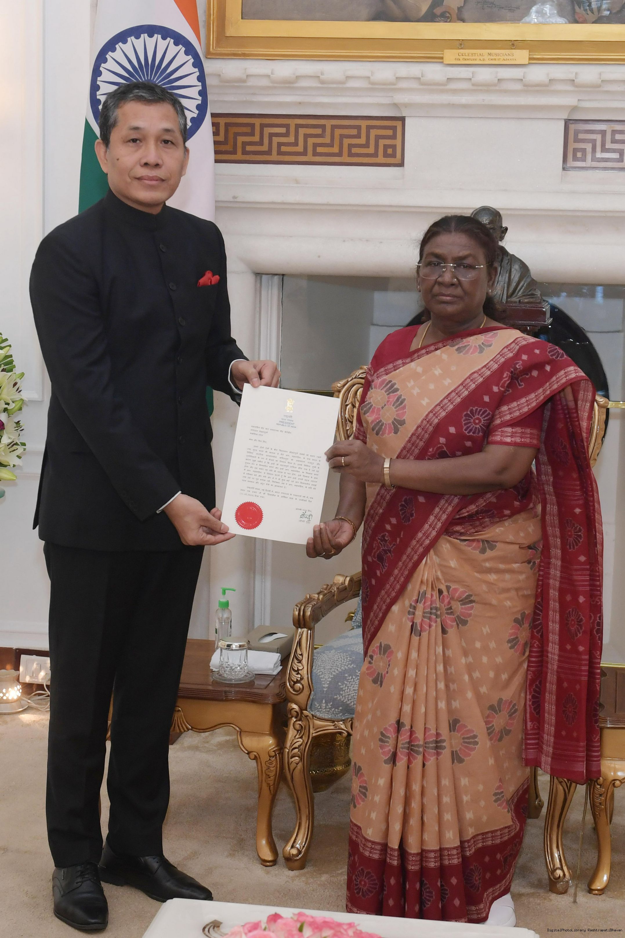 The Ambassador-designate of India to Combodia, Shri Vanlalvawna Bawitlung meeting with the President of India Smt. Droupadi Murmu at Rashtrapati Bhavan on November 19, 2024.