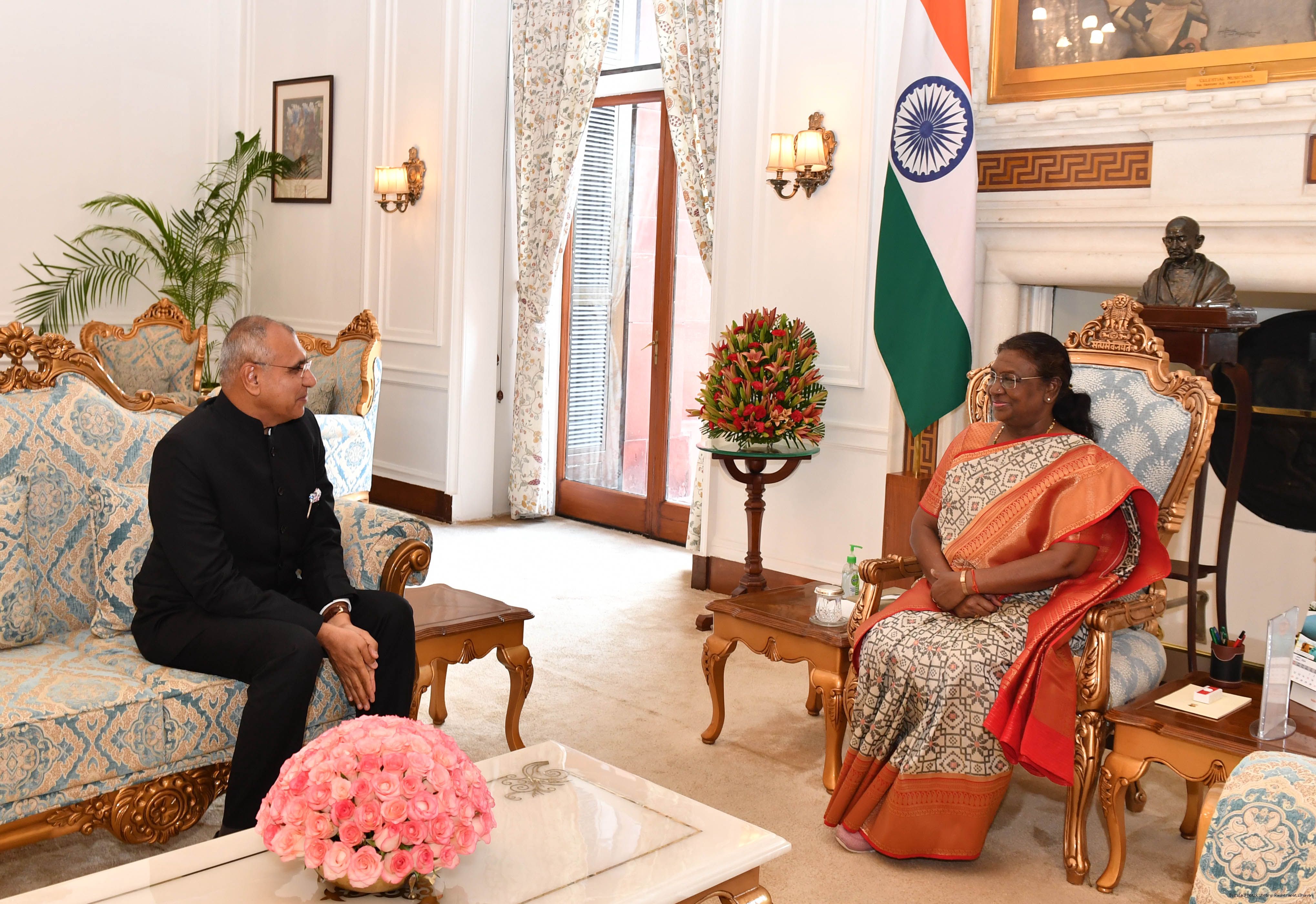 The High Commissioner-designate of India to Cameroon, Shri Vijay Khanduja meeting with the President of India Smt. Droupadi Murmu at Rashtrapati Bhavan on August 27, 2024.
