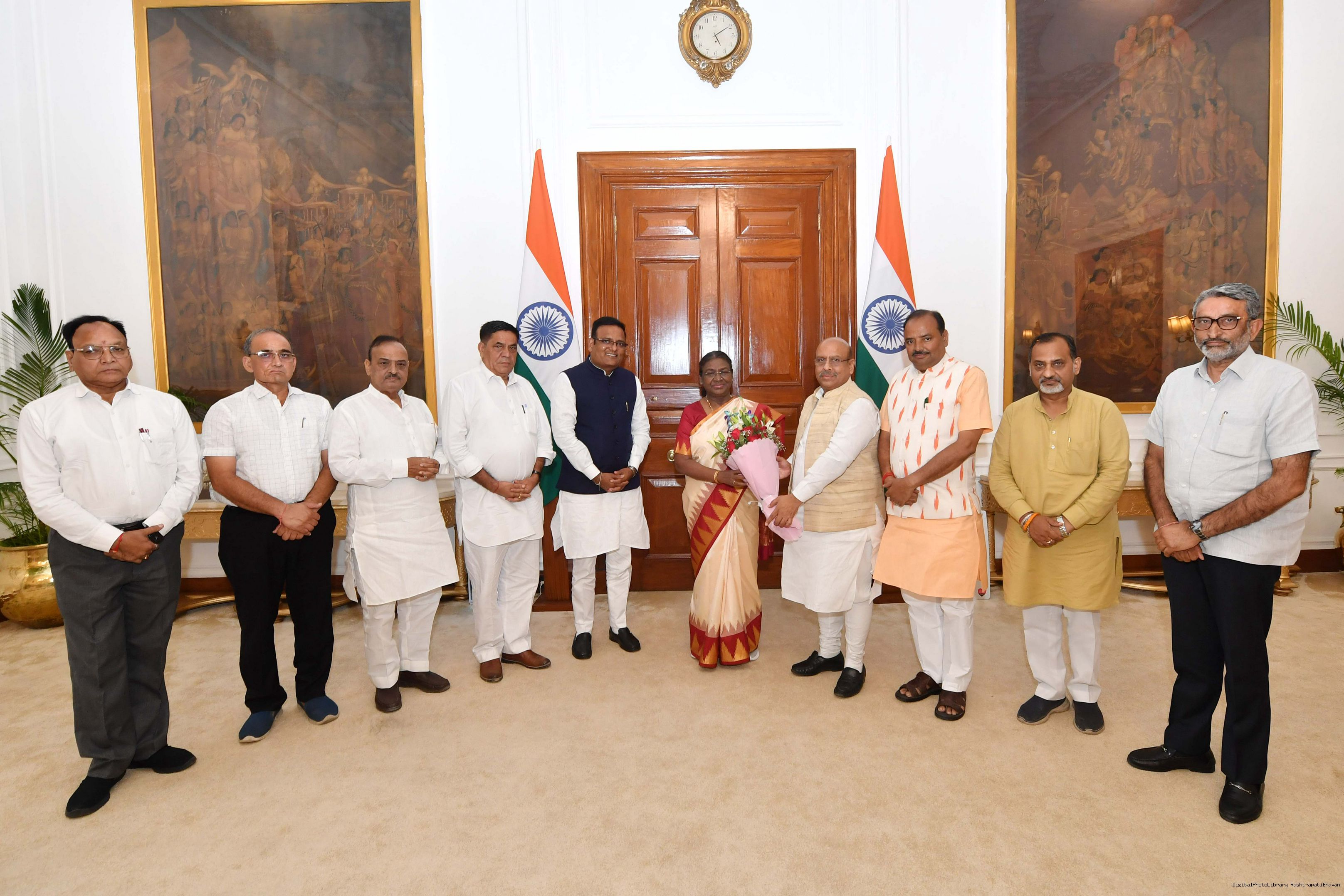 Shri Vijender Gupta, Leader of Opposition, Delhi Legislative Assembly along with others meeting with the President of India Smt. Droupadi Murmu at Rashtrapati Bhavan on August 30, 2024.