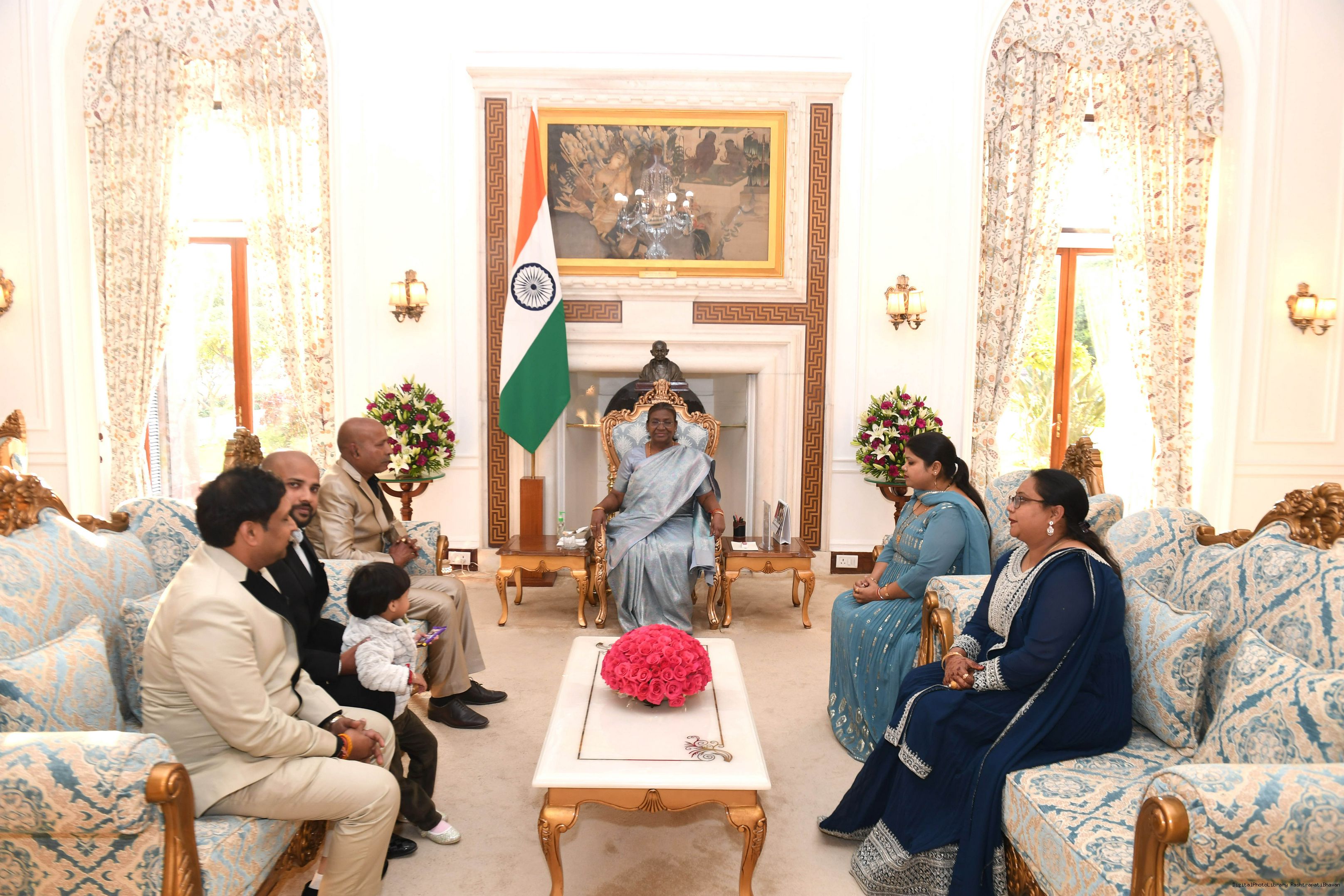 Shri Vipin Kumar, Head Room Attendant (Retd) along with his family members meeting with the President of India Smt Droupadi Murmu at Rashtrapati Bhavan on February 27, 2024.