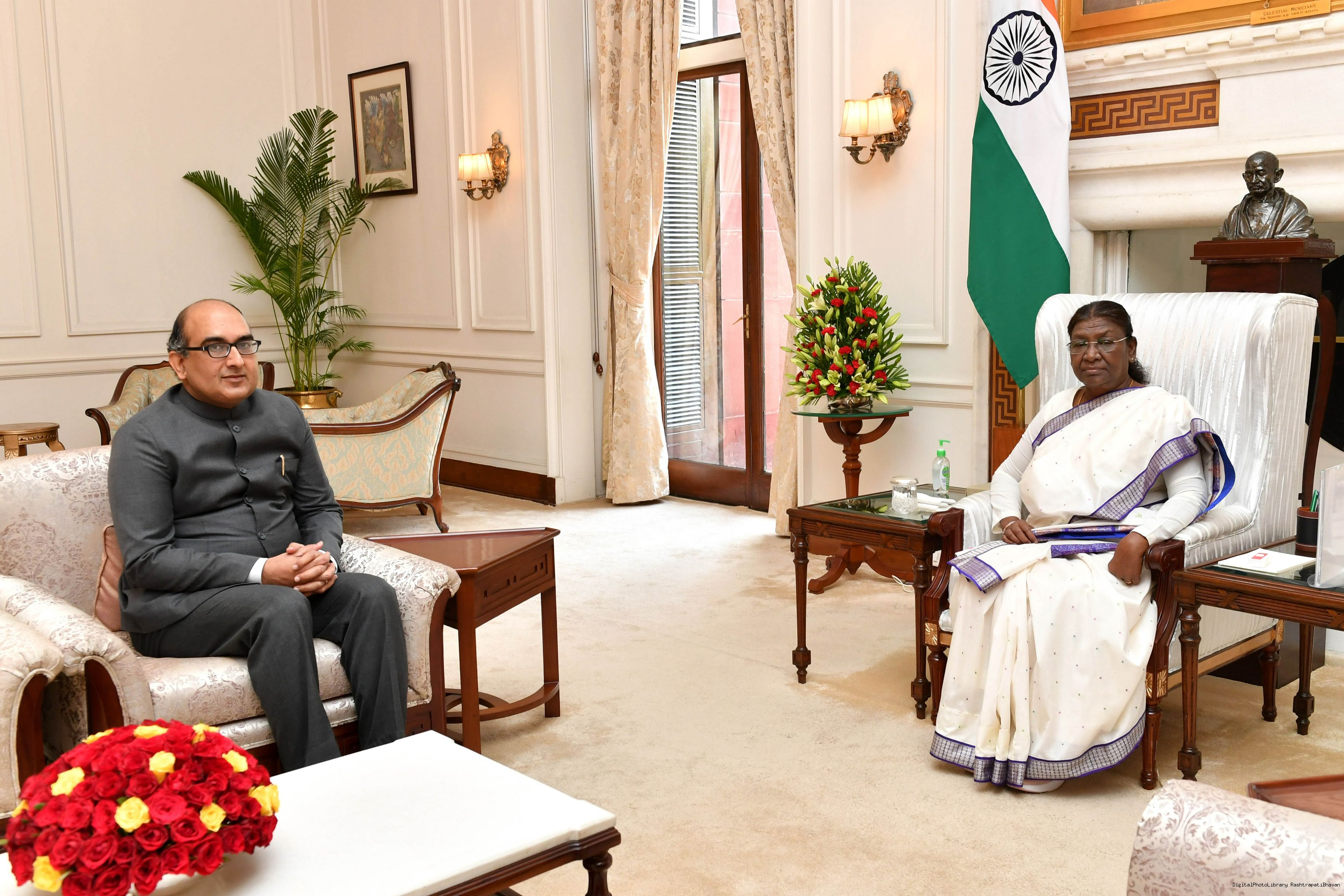 The Ambassador-designate of India to The State of Qatar, Shri Vipul meeting with the President of India, Smt. Droupadi Murmu at Rashtrapati Bhavan on July 21, 2023.