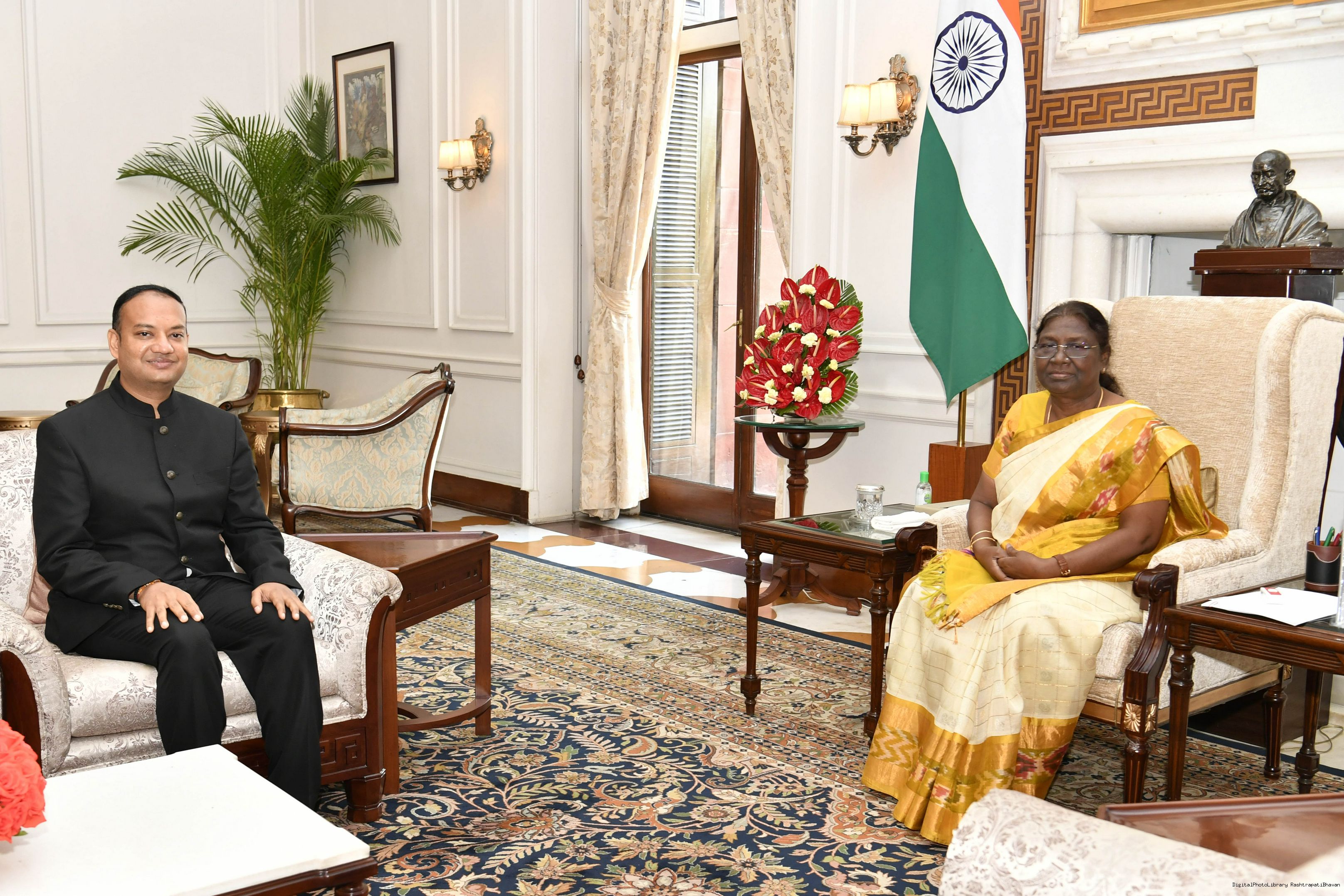 Shri Virendra Mittal meeting with the President of India, Smt. Droupadi Murmu, at Rashtrapati Bhavan on Aug 19, 2022.