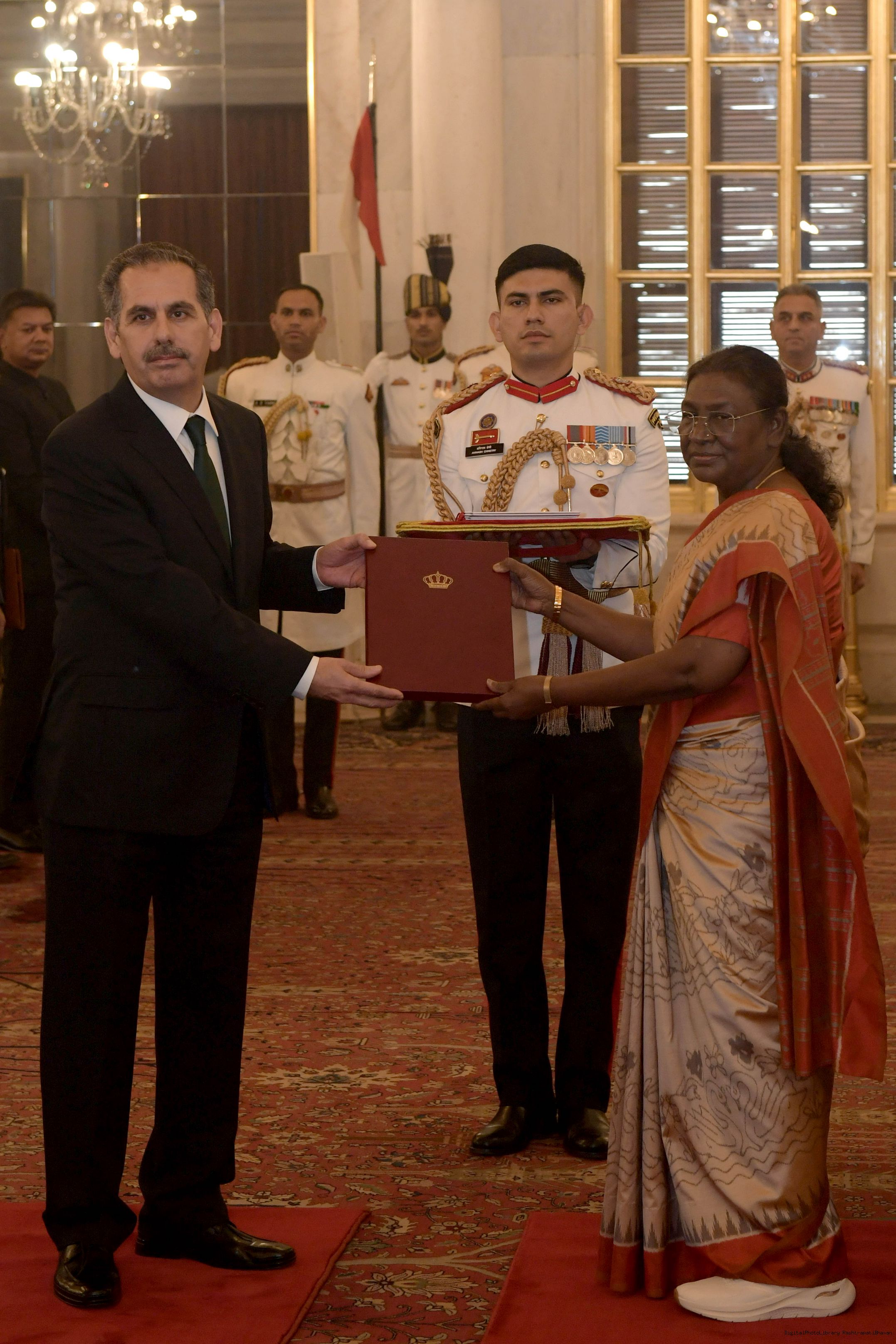 The Ambassador-designate of Hashemite Kingdom of Jordan, H.E. Mr. Yousef Mustafa Ali Abdel Ghani presenting his credentials to the President of India, Smt Droupadi Murmu at Rashtrapati Bhavan in New Delhi on November 18, 2024.