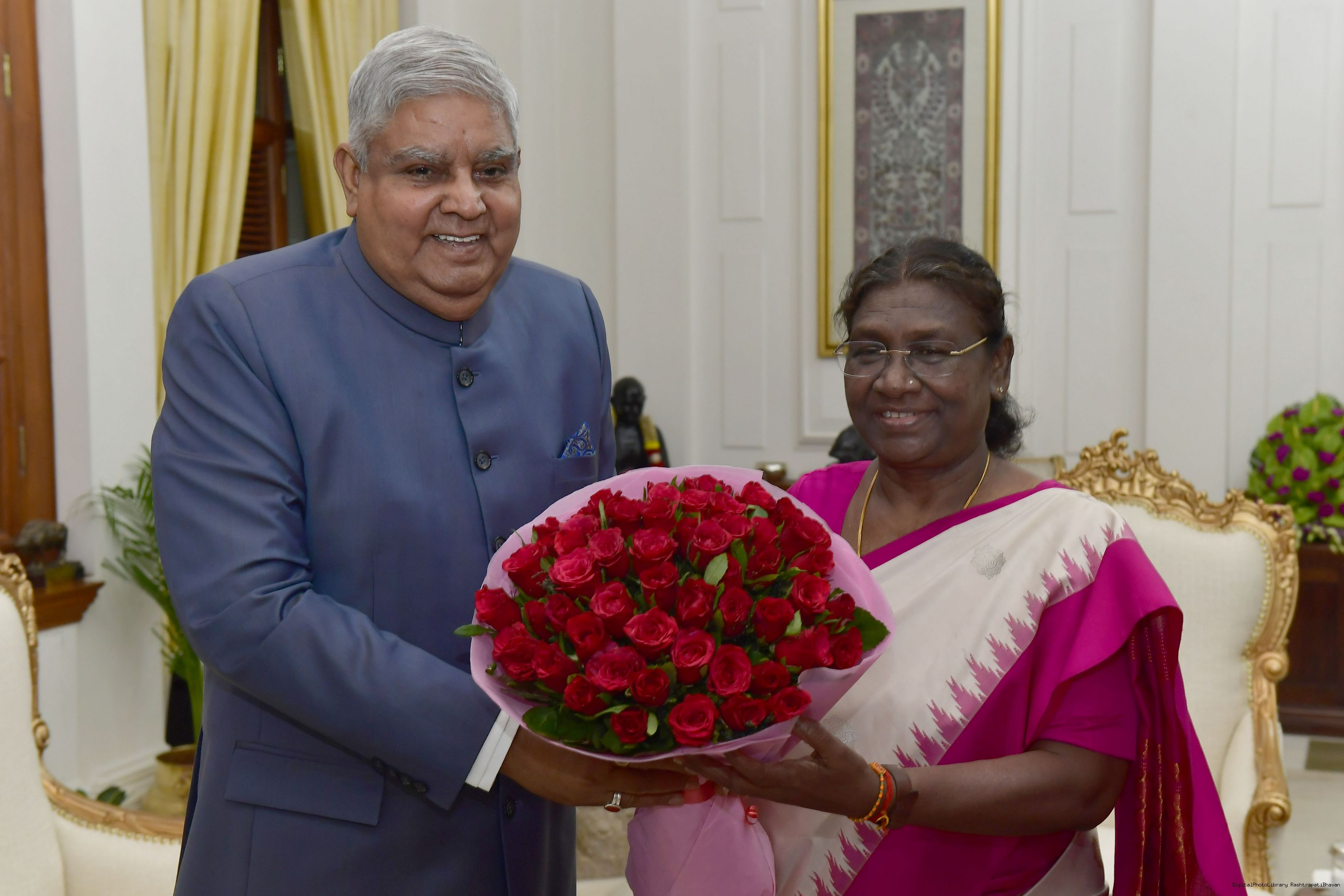The Vice President of India, Shri Jagdeep Dhankhar greeting the President of India, Smt. Droupadi Murmu, on her birthday, at Rashtrapati Bhavan on June 20, 2023