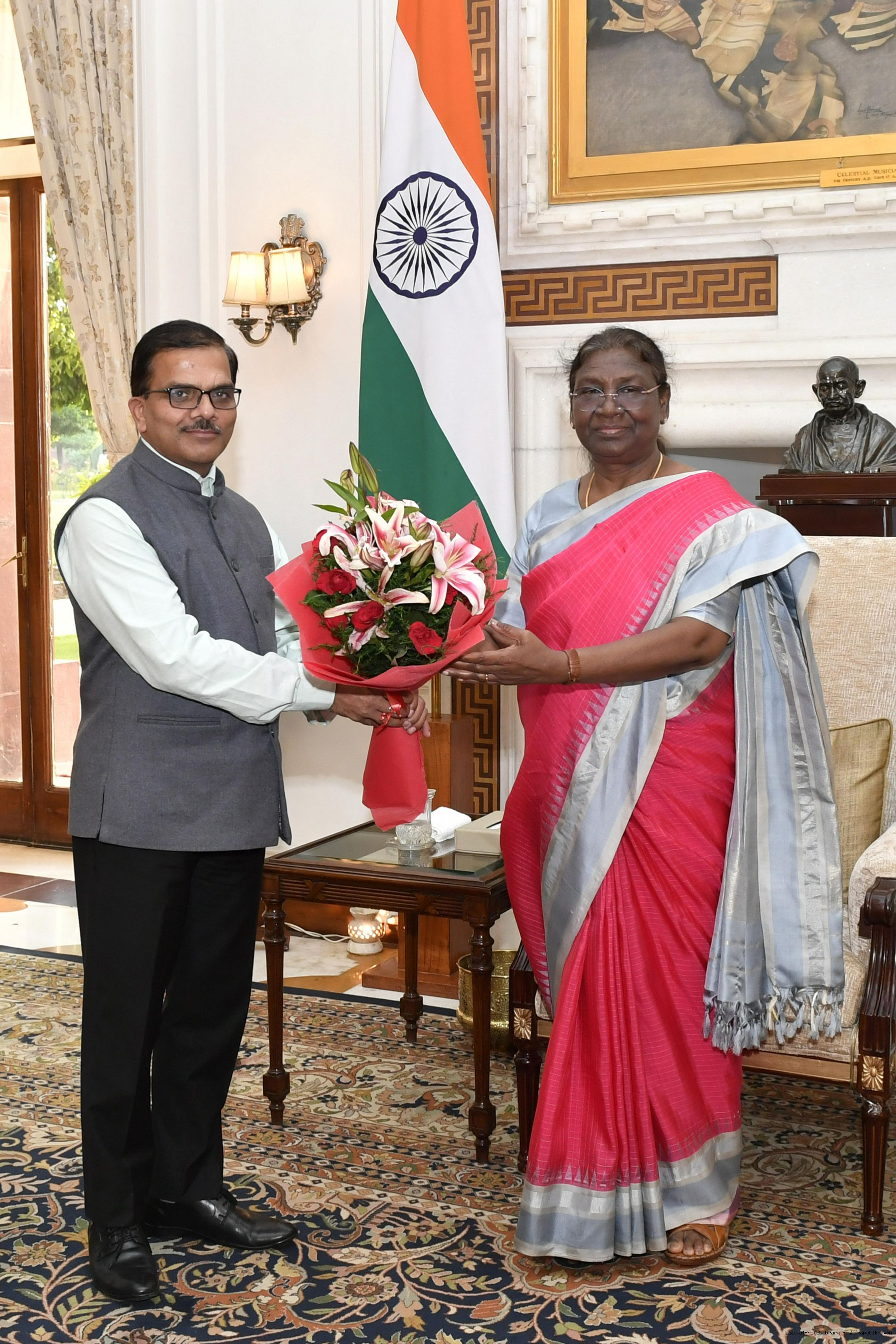 Prof. (Dr.) Vijay Kumar Srivastava, Vice Chancellor, The Maharaja Sayajirao University of Baroda, Vadodara meeting with the President of India, Smt. Droupadi Murmu, at Rashtrapati Bhavan on Sep 08, 2022.