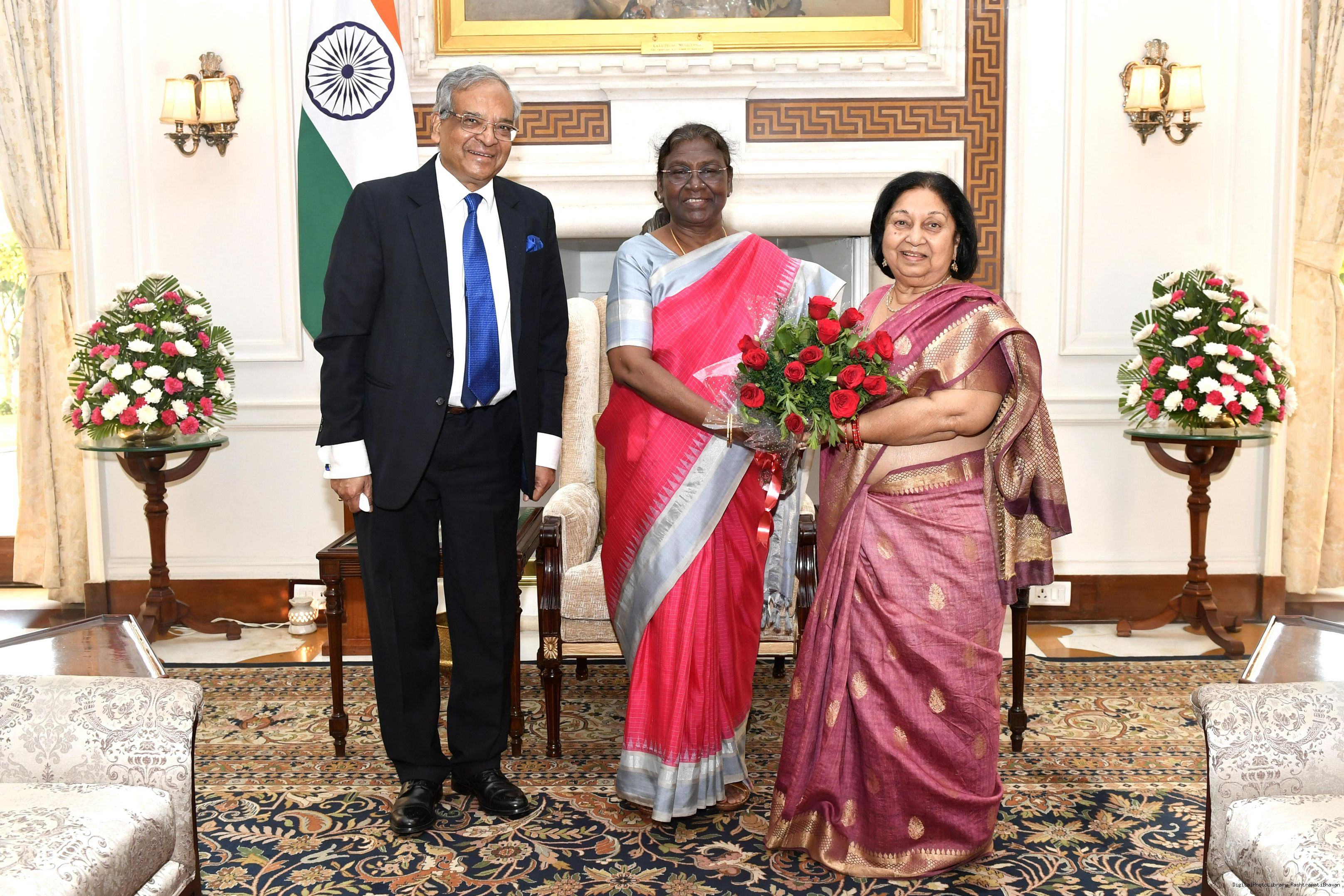Shri Dhanendra Kumar, former Chairperson, Competition Commission of India along with his wife meeting with the President of India, Smt. Droupadi Murmu, at Rashtrapati Bhavan on Sep 07, 2022.