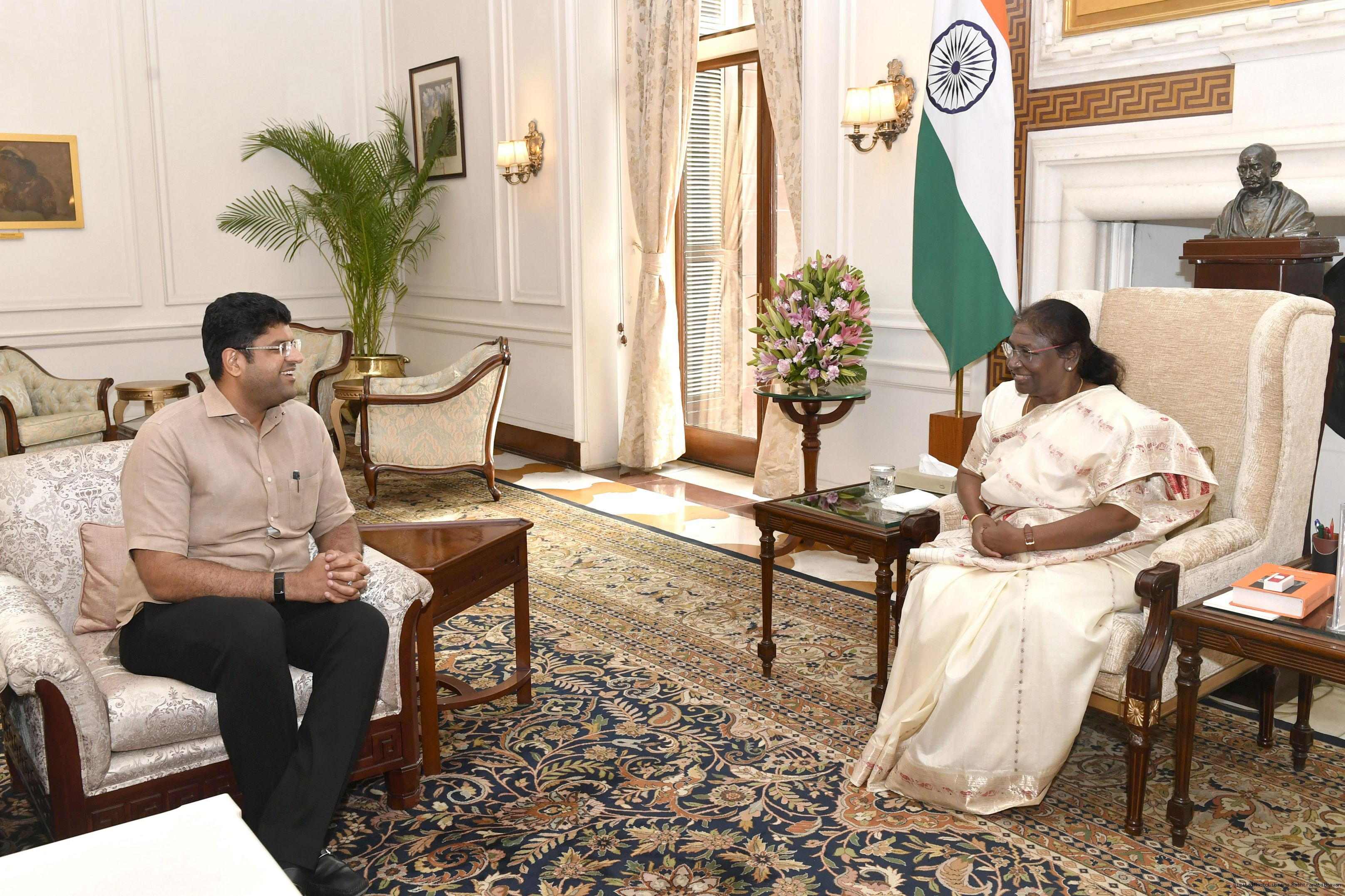 The Deputy Chief Minister of Haryana, Shri Dushyant Chautala calling on the President of India, Smt. Droupadi Murmu, at Rashtrapati Bhavan on September 08, 2022.