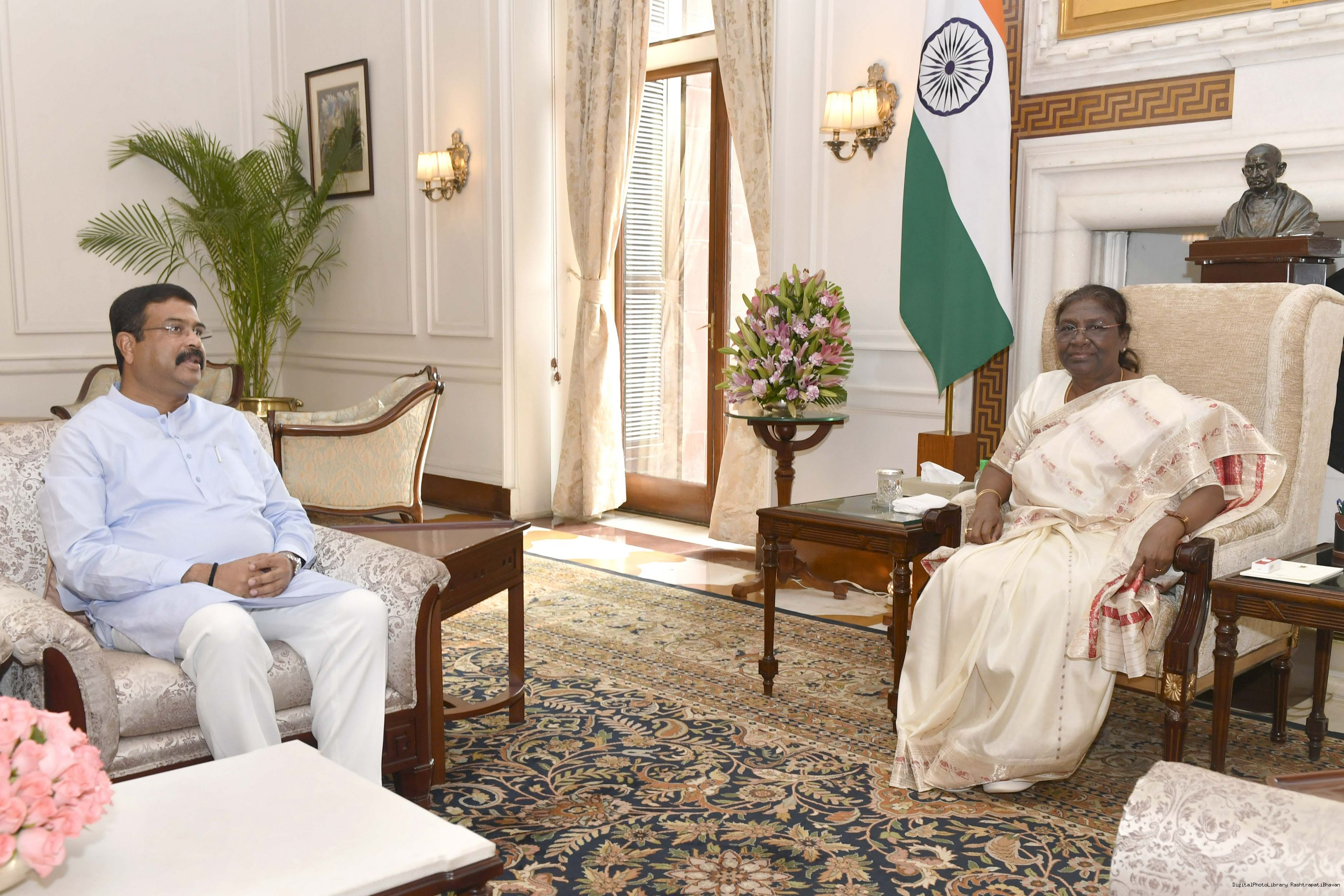 The Union Minister for Education and Skill Development Entrepreneurship, Shri Dharmendra Pradhan calling on the President of India, Smt. Droupadi Murmu, at Rashtrapati Bhavan on September 08, 2022.