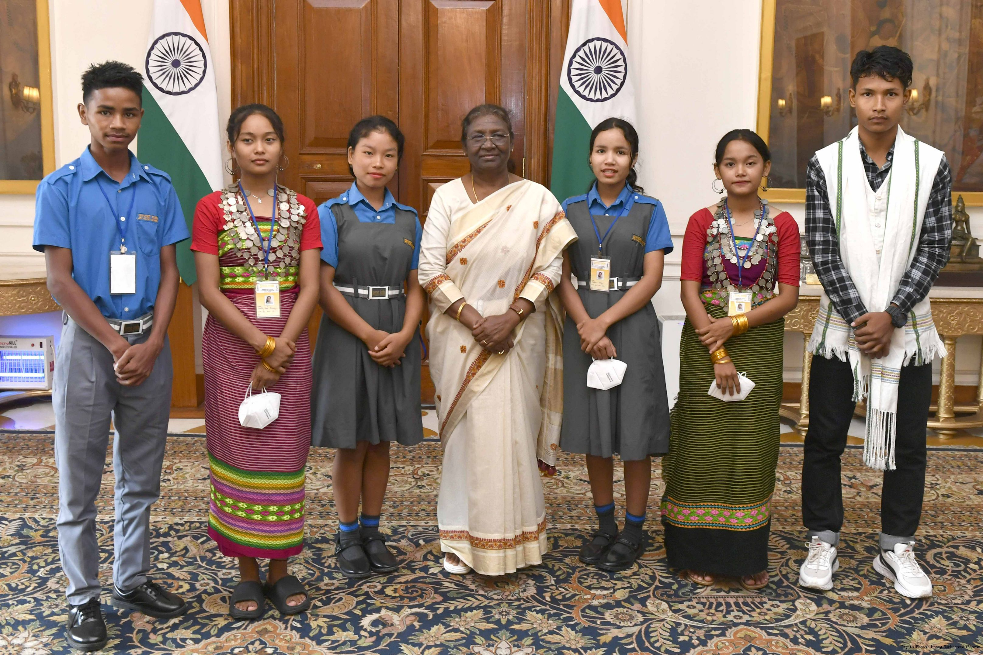 The Chairman, Akshaya Patra Foundation, Shri Madhu Pandit Dasa along with a group of tribal children from Tripura meeting the President of India, Smt. Droupadi Murmu, at Rashtrapati Bhavan on September 08, 2022.