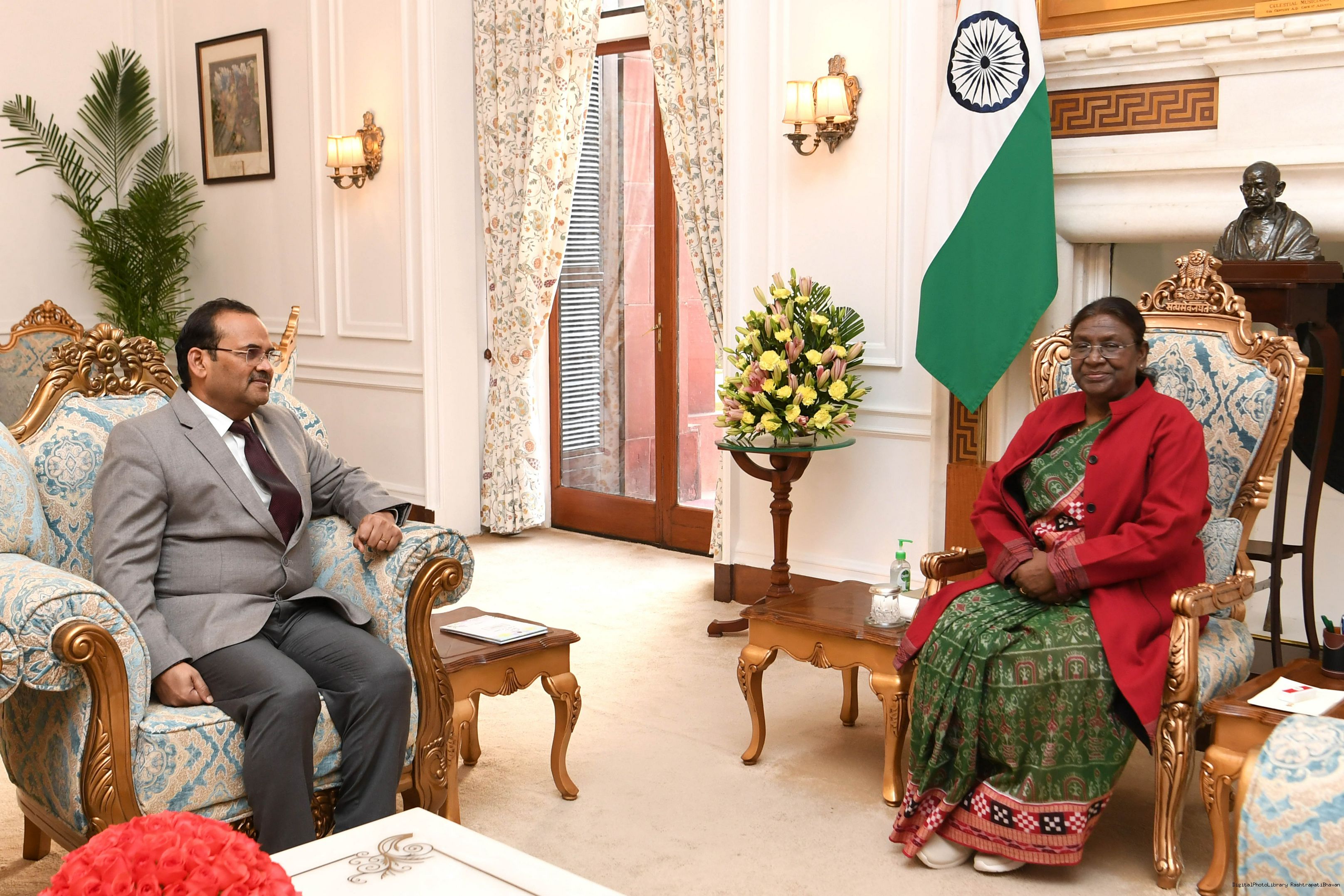 Shri Justice JK Maheshwari, Judge Supreme Court of India meeting with the President of India, Smt. Droupadi Murmu, at Rashtrapati Bhavan on Jan 10, 2024.