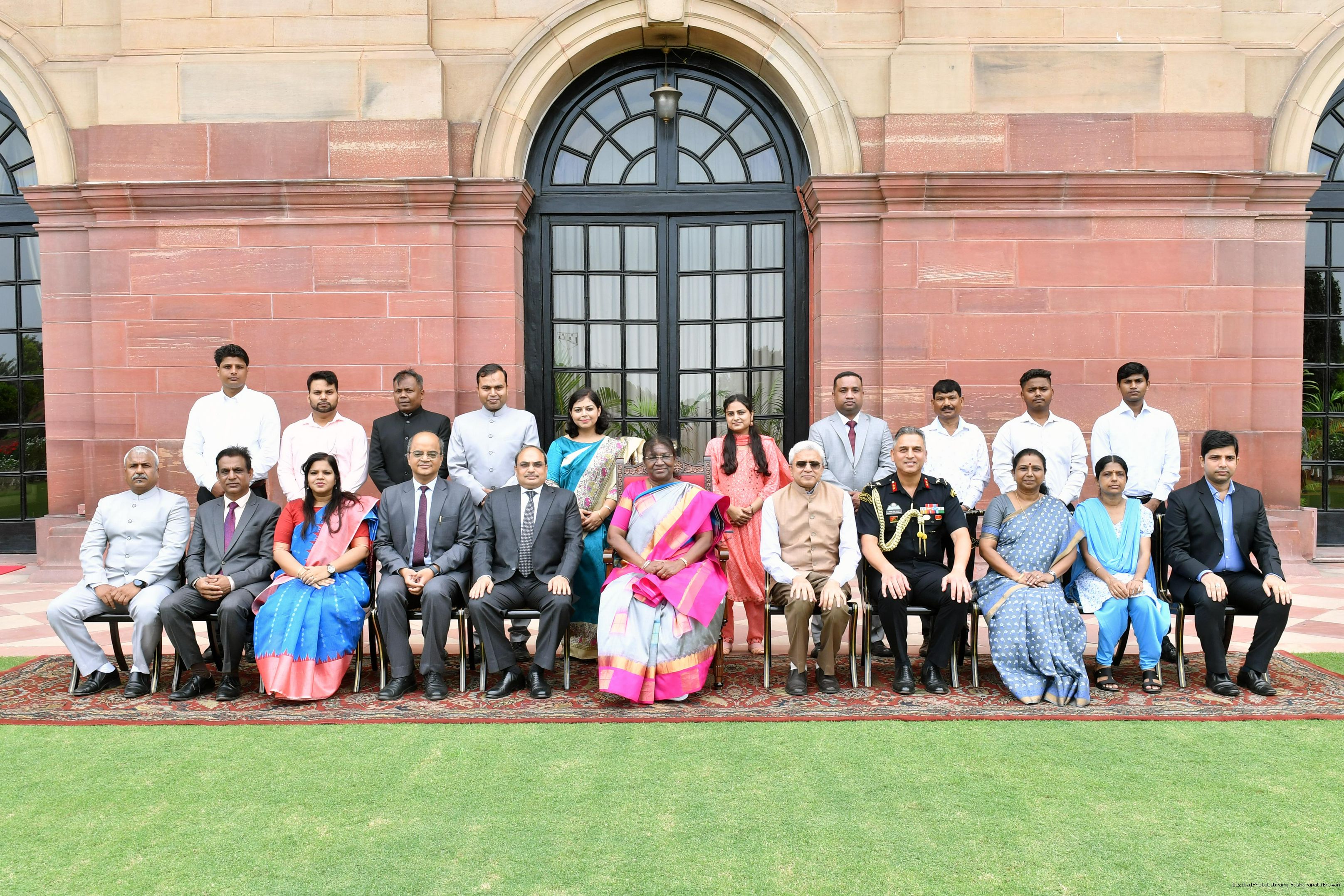 The President of India Smt. Droupadi Murmu posing a Group Photographs with senior officers of President's Secretariat and other staff members at Rashtrapati Bhavan on August 09, 2023.