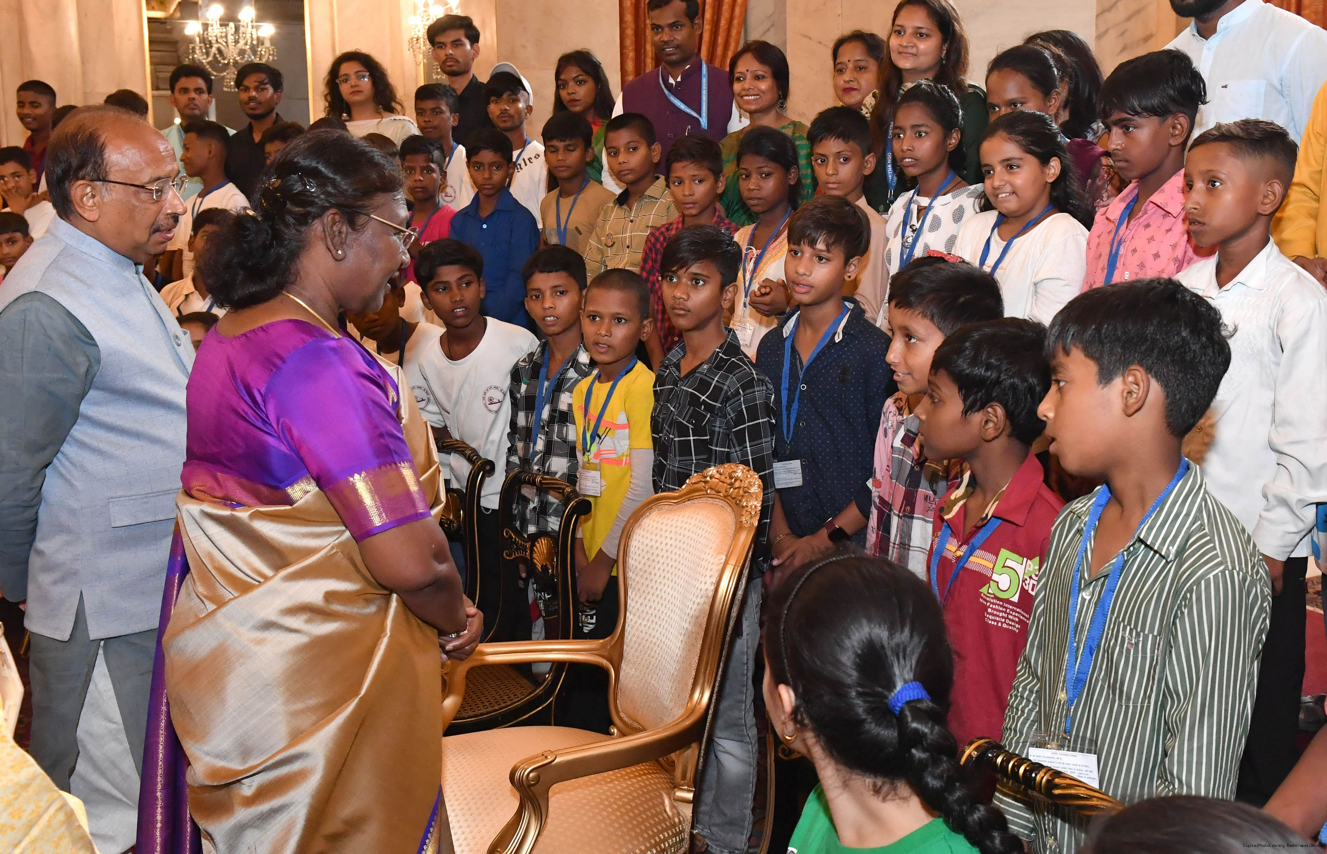 The President of india Smt. Droupadi Murmu posing a group Photograph with 160 Children participating in the 12 days long Gandhi Summer School Camp organized by the Gandhi Smriti and Darshan Samiti, Delhi at Rashtrapati Bhavan on June 30, 2023.